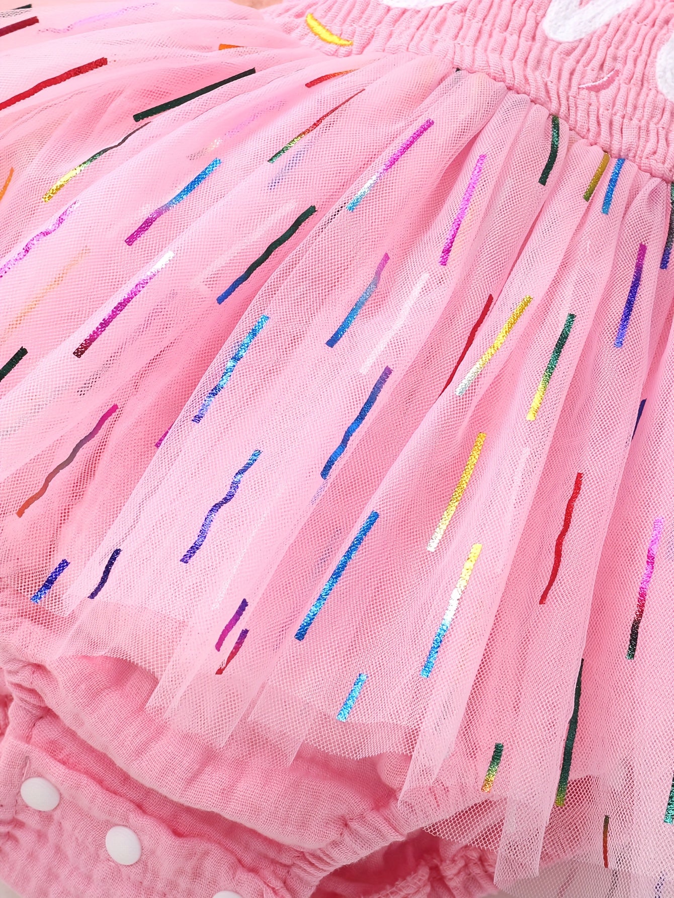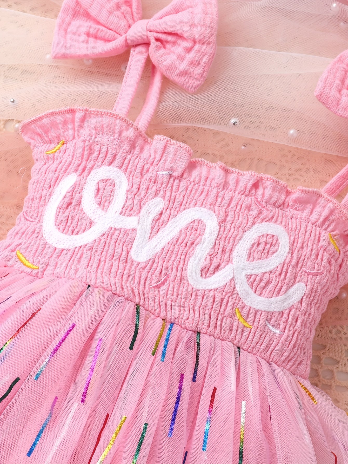 2pcs Soft and Comfortable Fashionable Cute Girls' Letter Print Parallel Ruffle Bow Tie Halter Neck Gradient Color Stripes Mesh Dress Bodysuit and Hairband Set