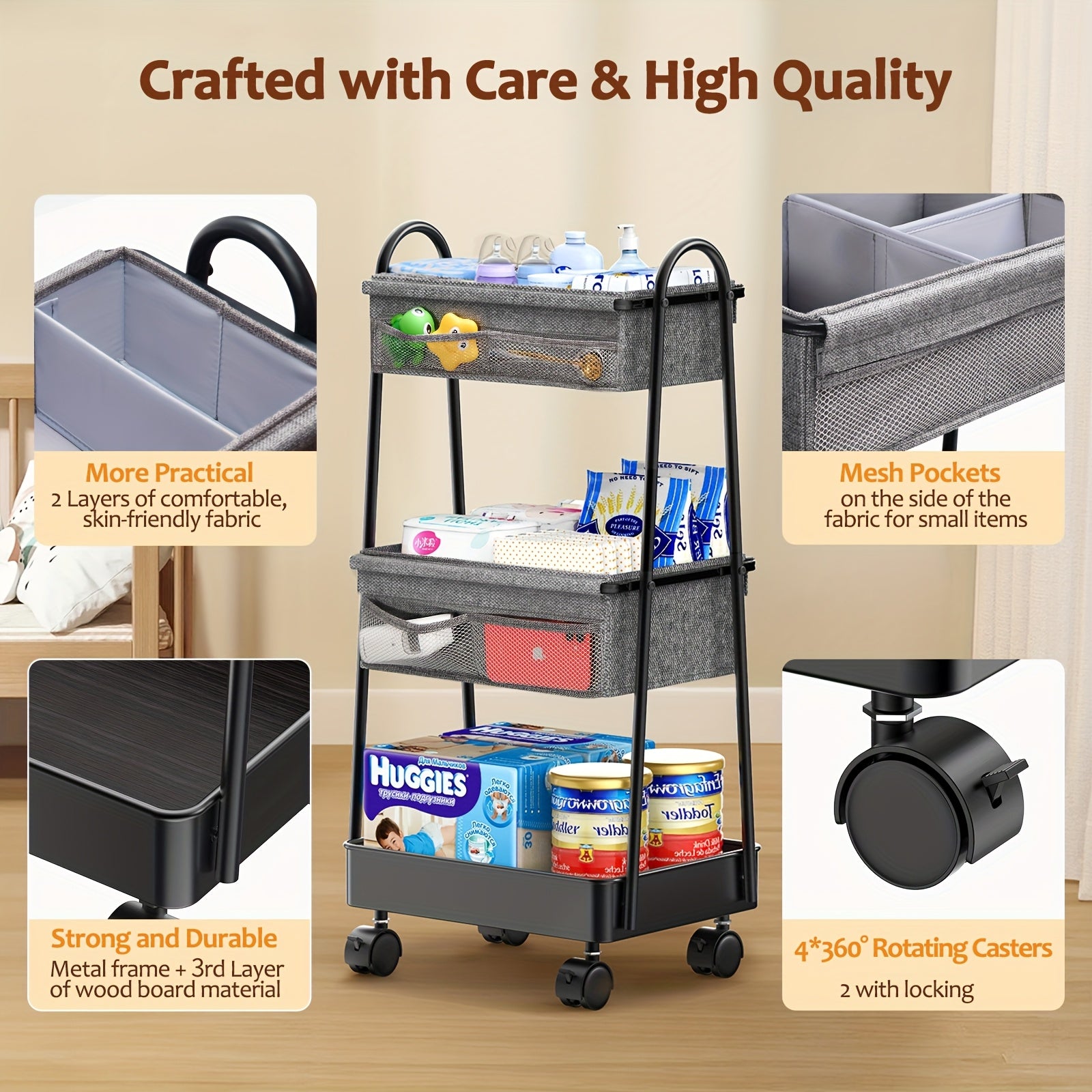 - Rolling Wheels: Effortlessly move the cart from room to room, so you’re always prepared, whether in the nursery or living room.