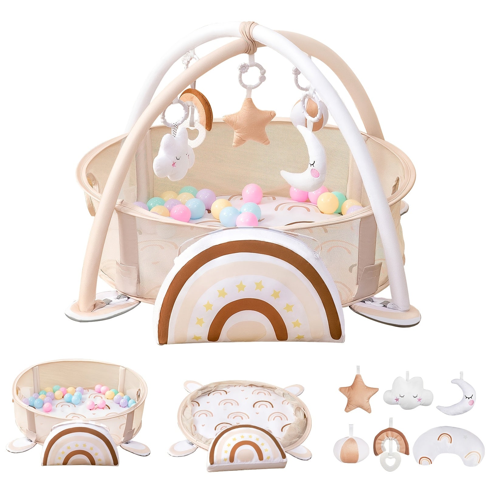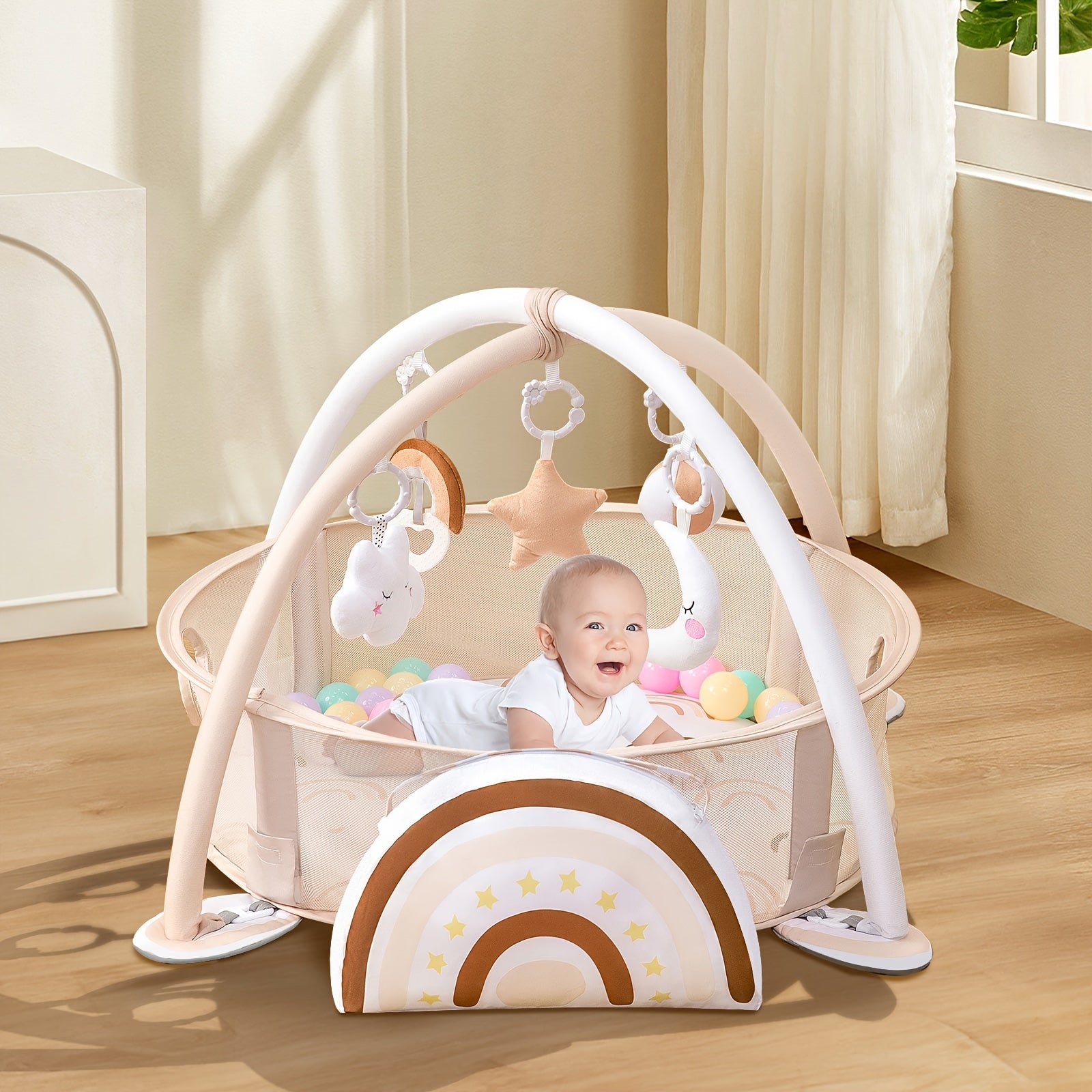 Crafted from high-quality fabric, this mat features a soft, light beige color that complements any playroom decor. The 4 in 1 design incorporates various interactive elements, including colorful balls and sensory toys, ensuring endless entertainment and developmental benefits. Unlike typical play mats, which often lack versatility, this game mat offers multiple functions: