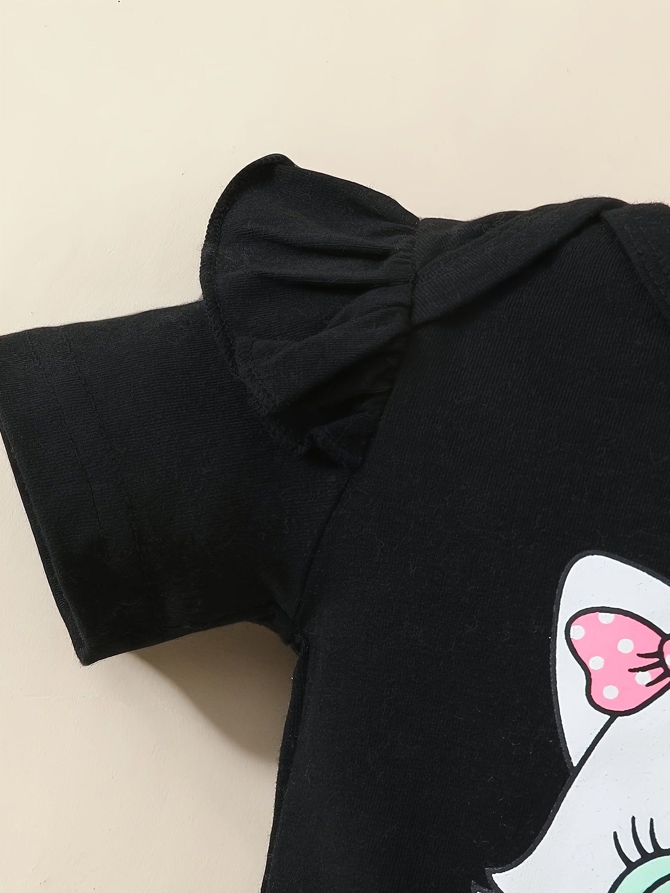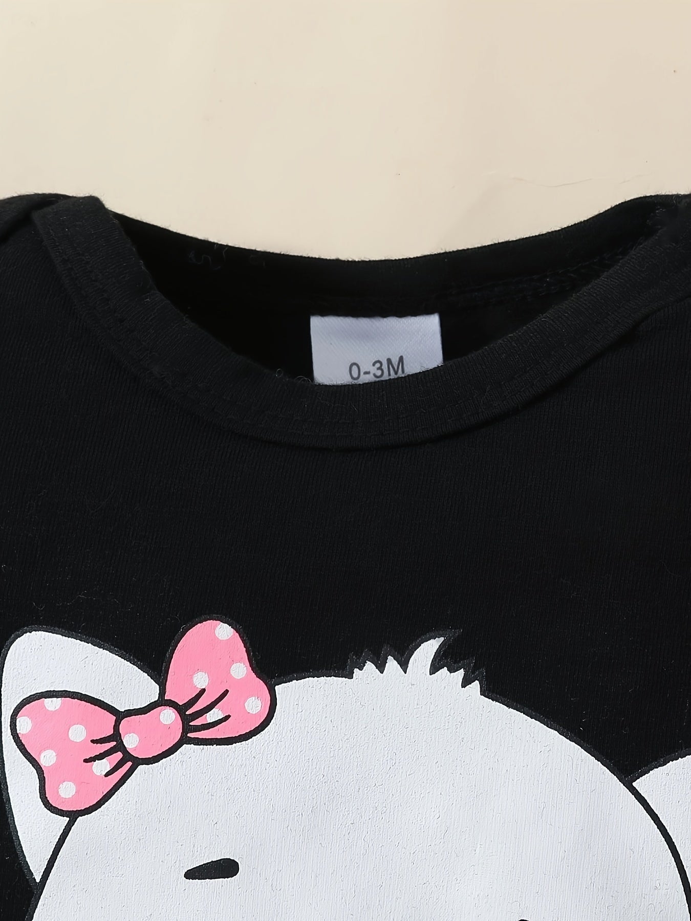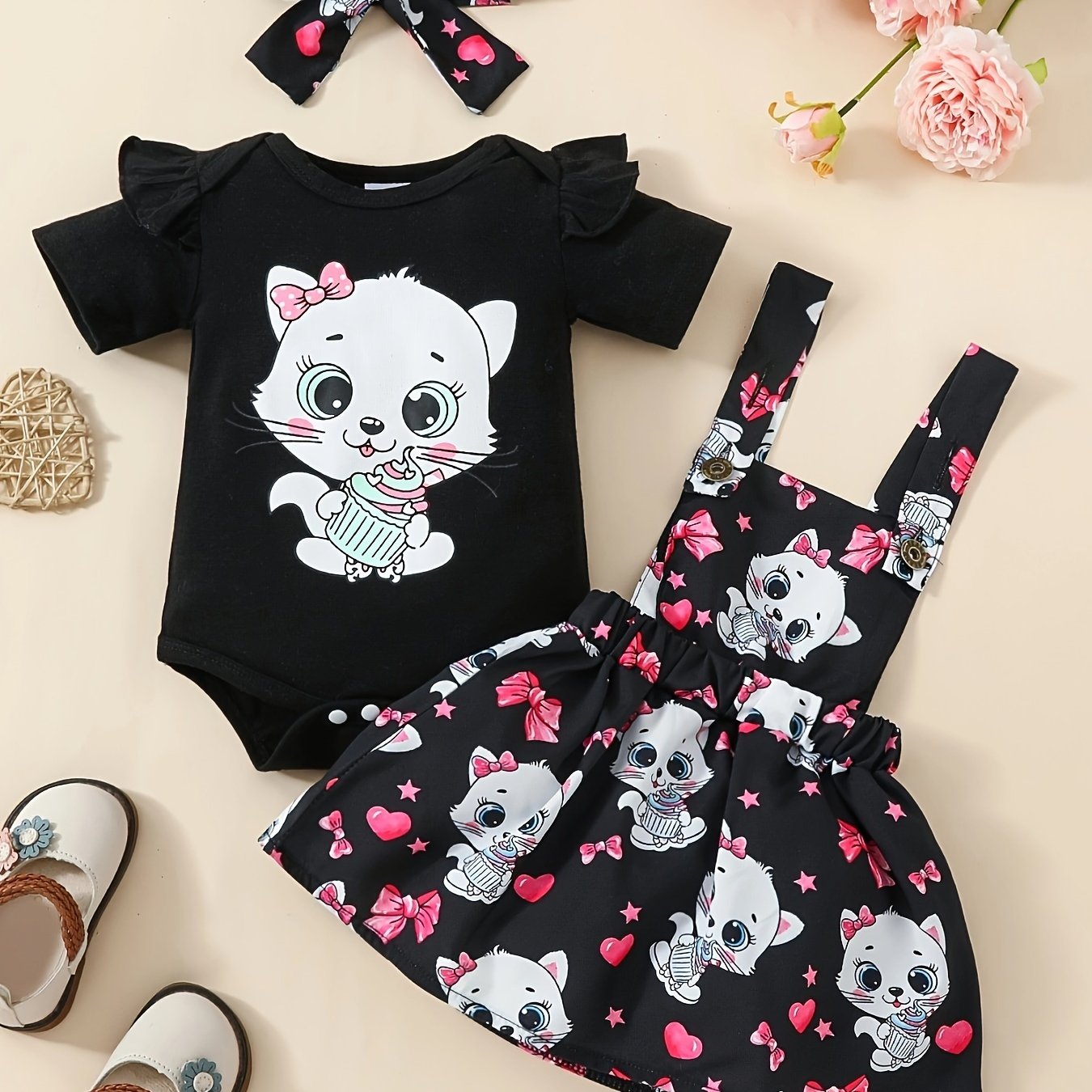 Adorable 3pcs Baby Girl's Outfit Set - Cute Cat & Heart Print Romper, Bowknot Suspender Skirt with Matching Bandana - Soft Cotton Blend for Summer, Perfect for Outdoor