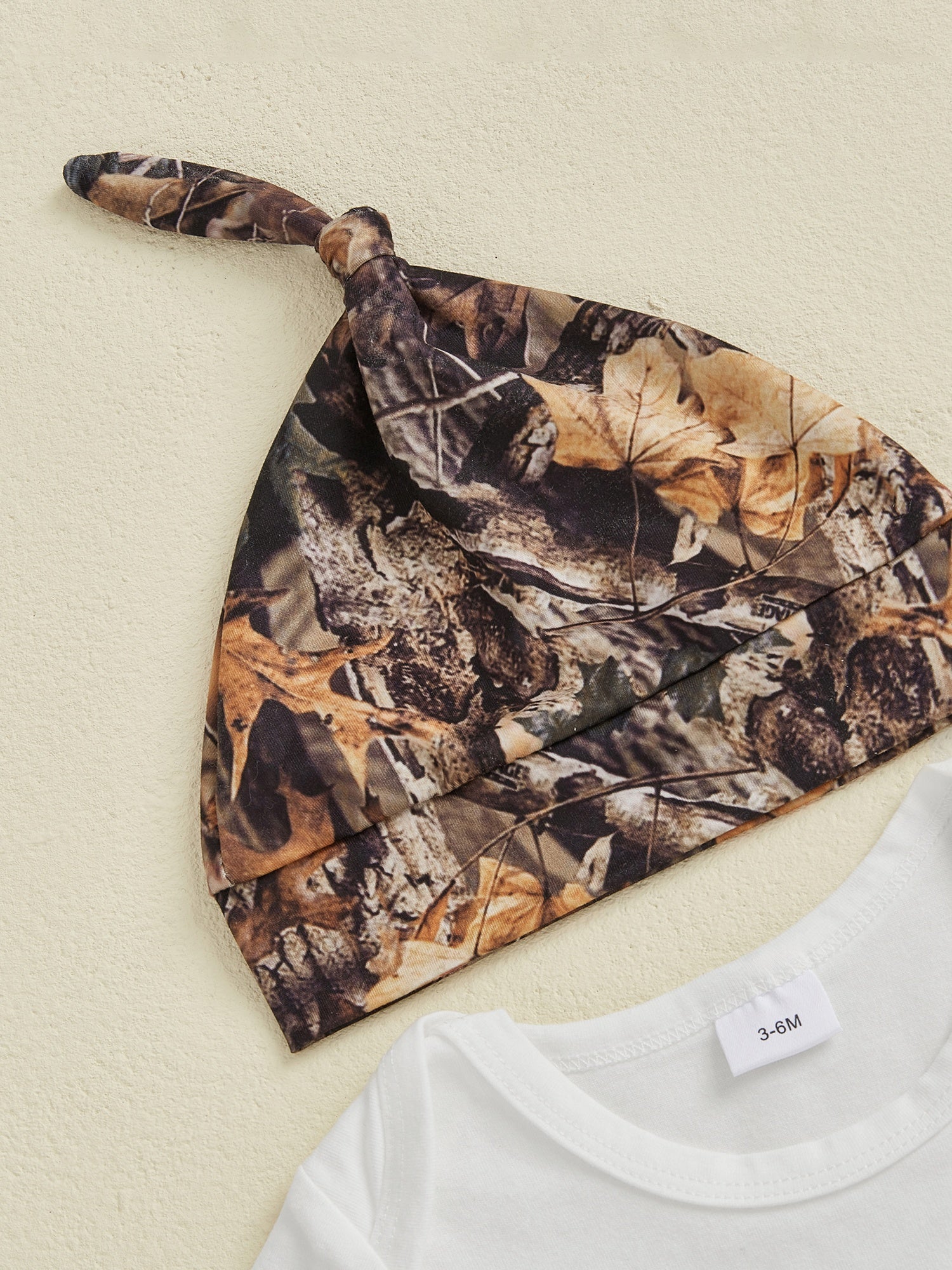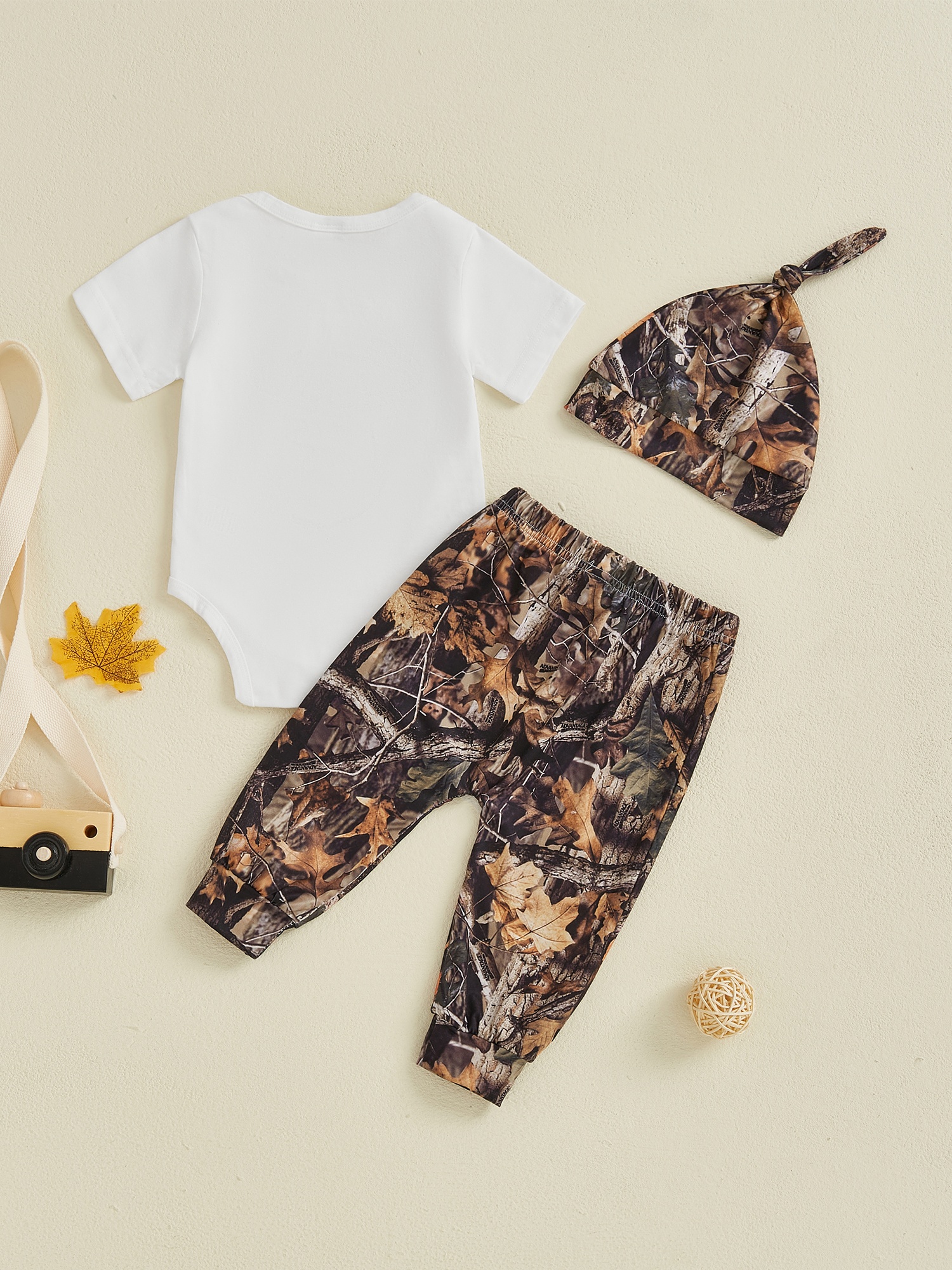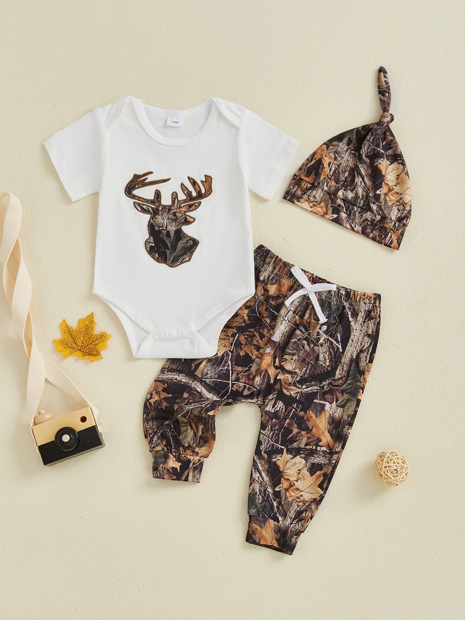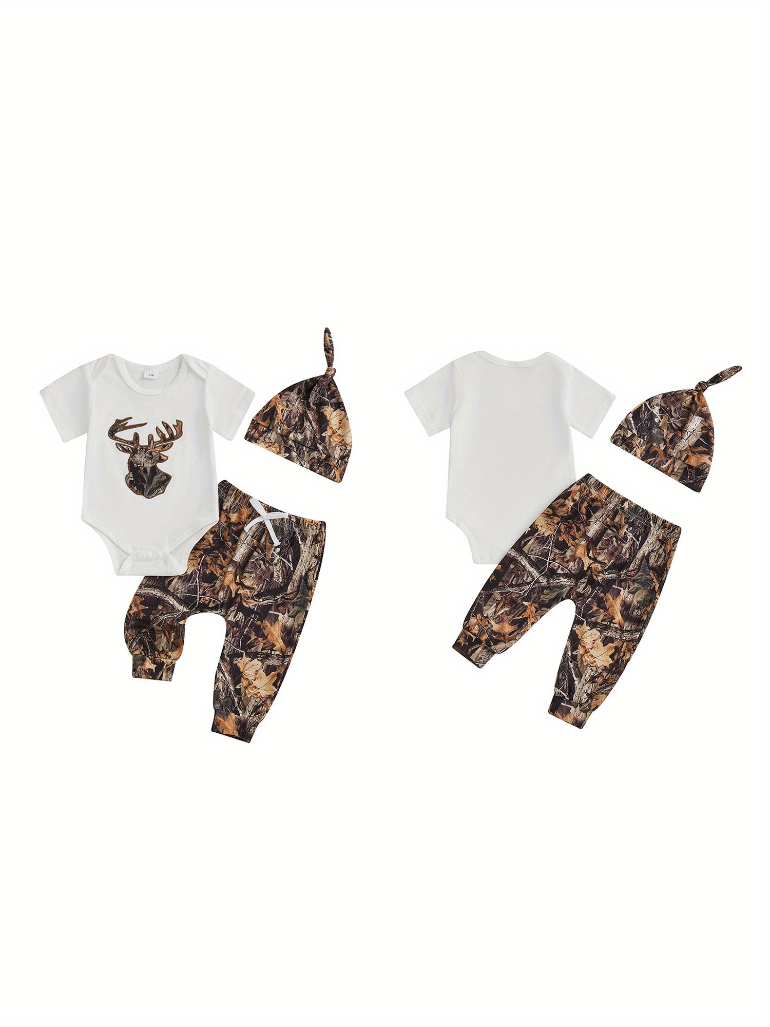 Baby Boys Summer Outfits Deer Antler Print Round Neck Short Sleeve Rompers Long Pants Hat 3pcs Clothes Set, for Outdoor