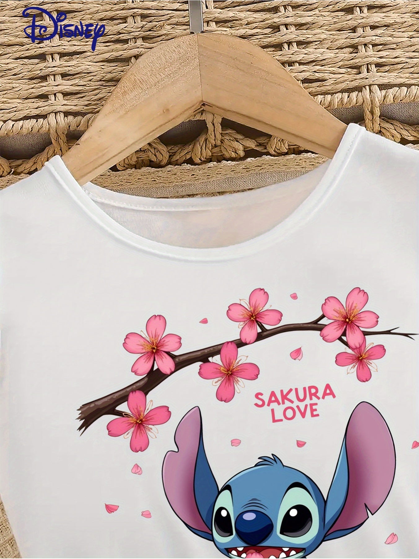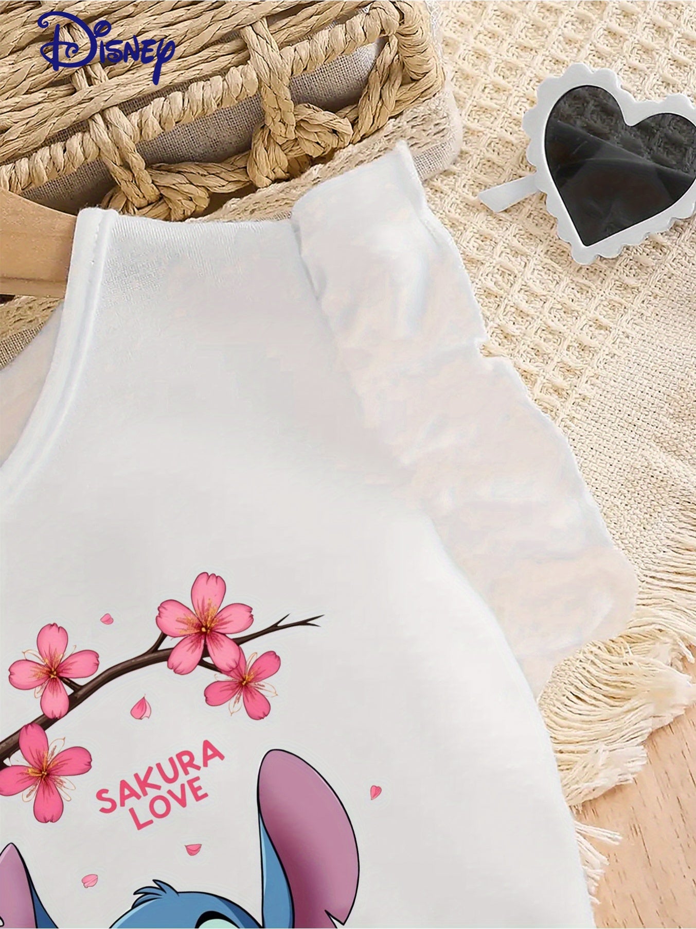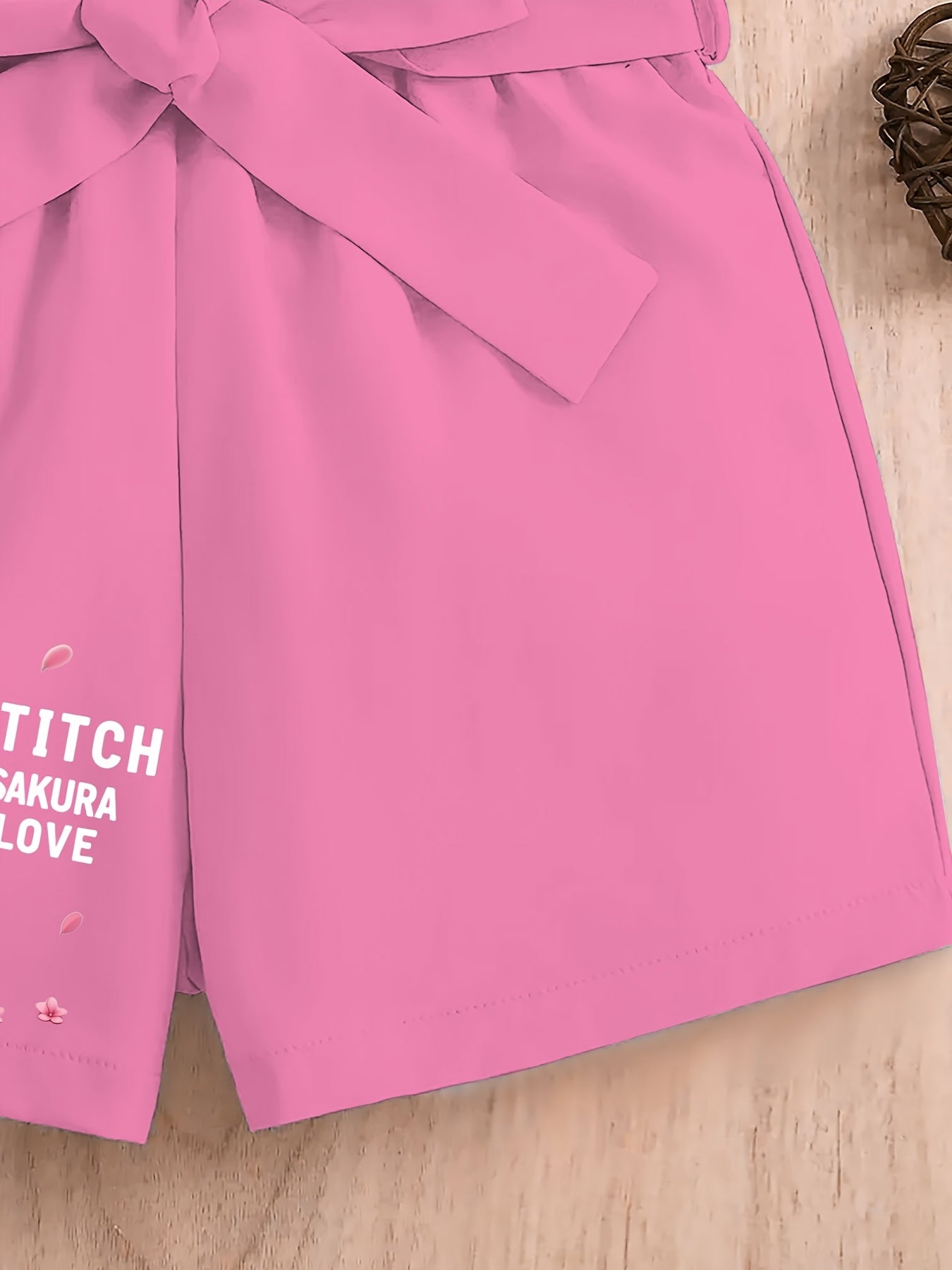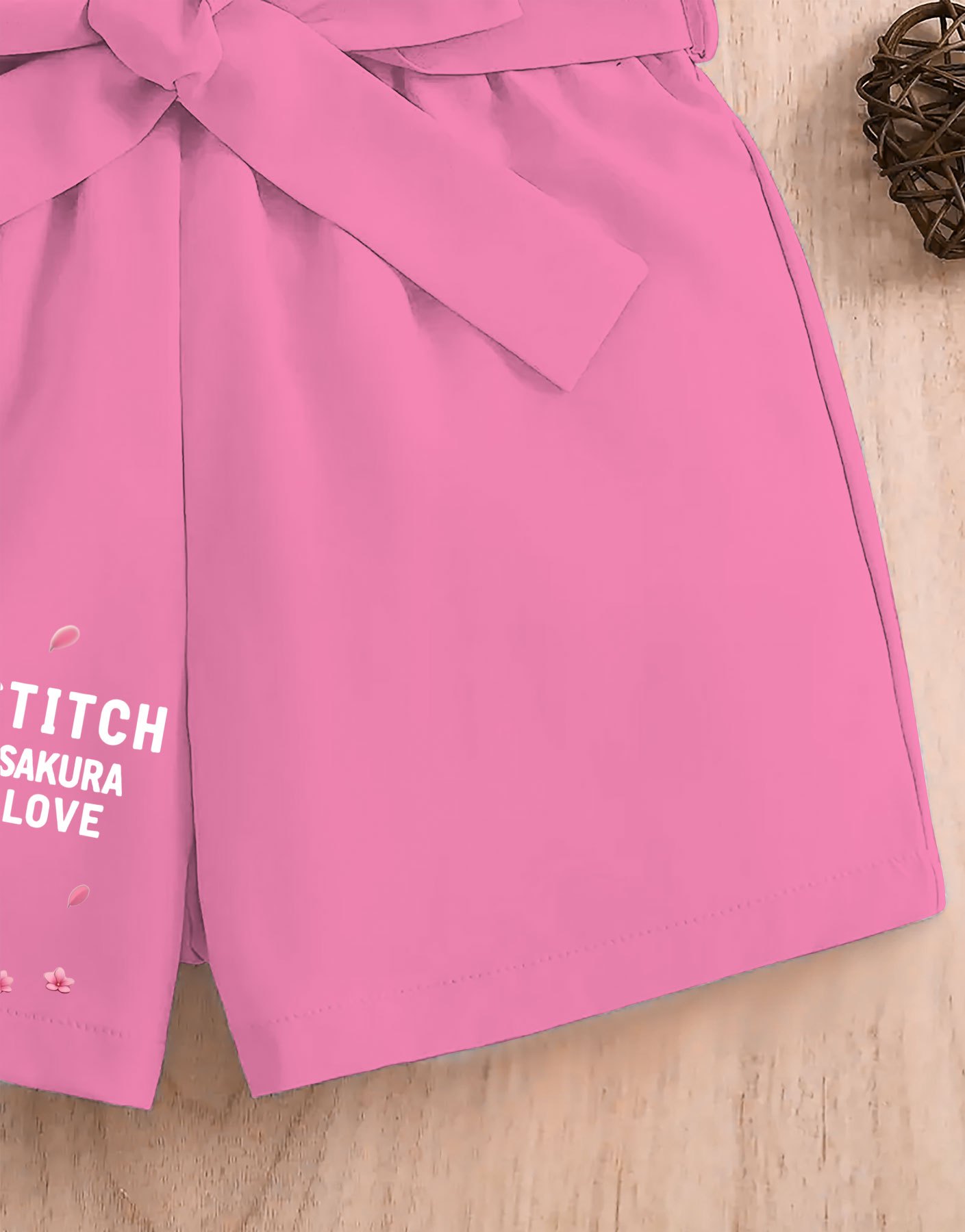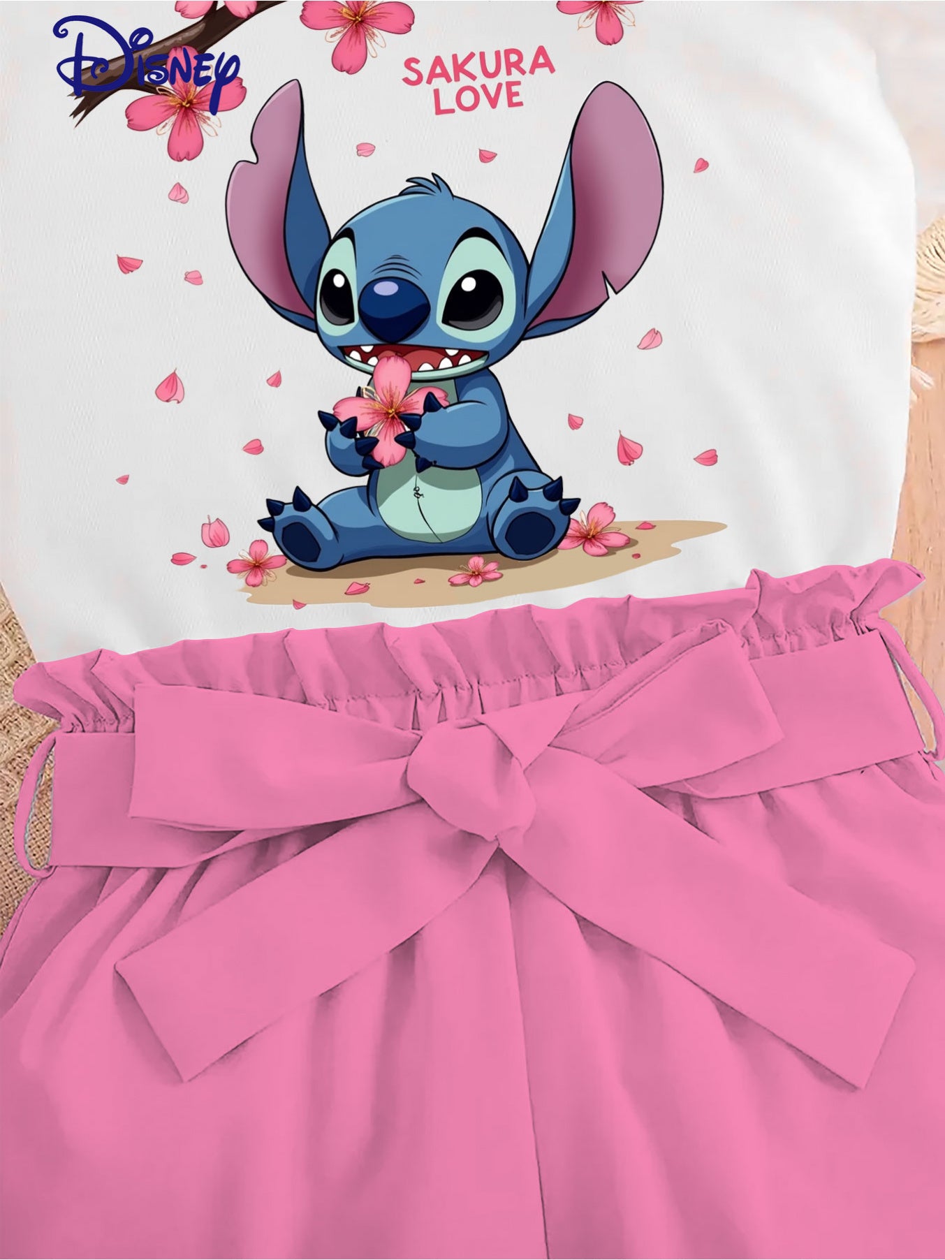 Disney Stitch Girls 2pcs Set, Floral Print Top and Belted Shorts, Perfect for Summer Kids' Party Outdoors Activities