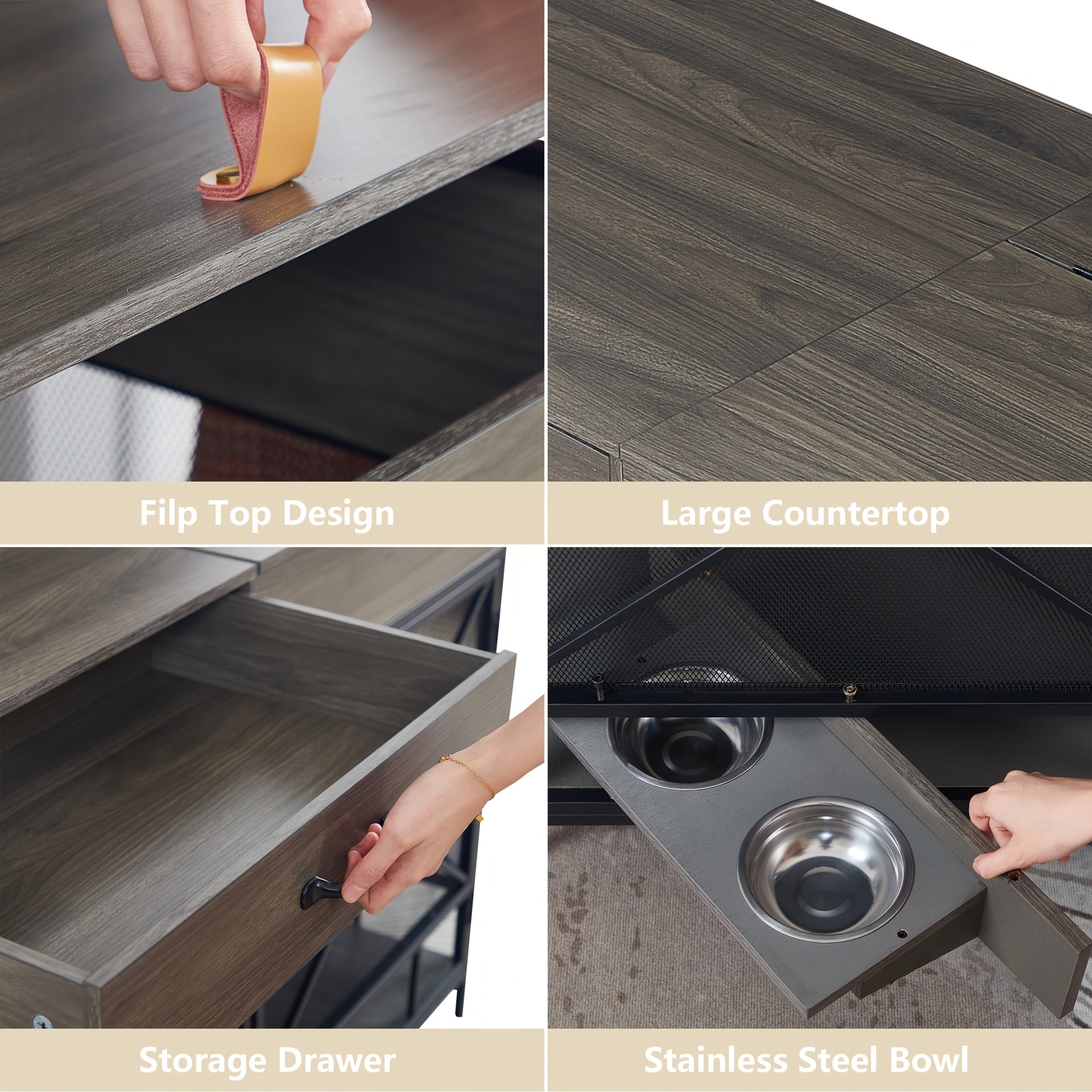 Large Dog Crate Furniture 47 Inch Wooden Kennel Indoor End Table with Drawer and Bowls