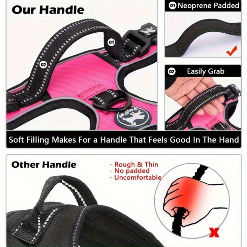 The harness distributes pressure evenly across the body to avoid choking. It features a comfortable padded handle on top, allowing you to maintain control of your dog during excited moments or when assistance is needed. This design makes it easy to manage dogs, especially when navigating steps, stairs, or vehicles. The soft handle of the leash protects your hand from tugs and pulls, reducing chafing and enhancing your control during walks. Additionally, it includes reflective stitching for added safety.