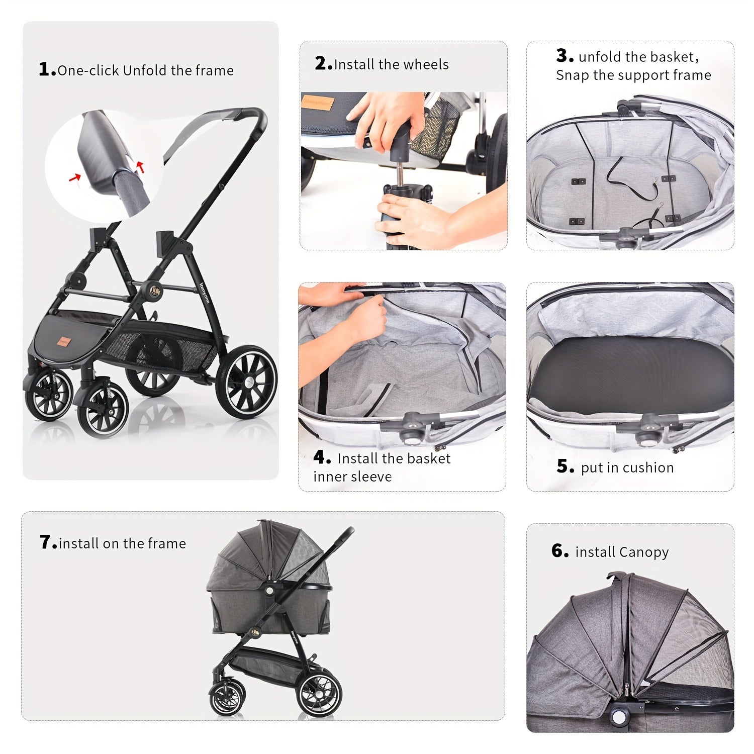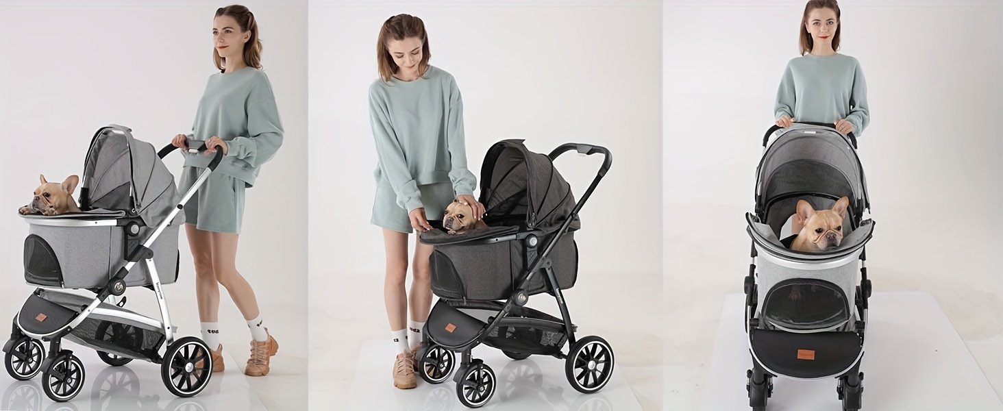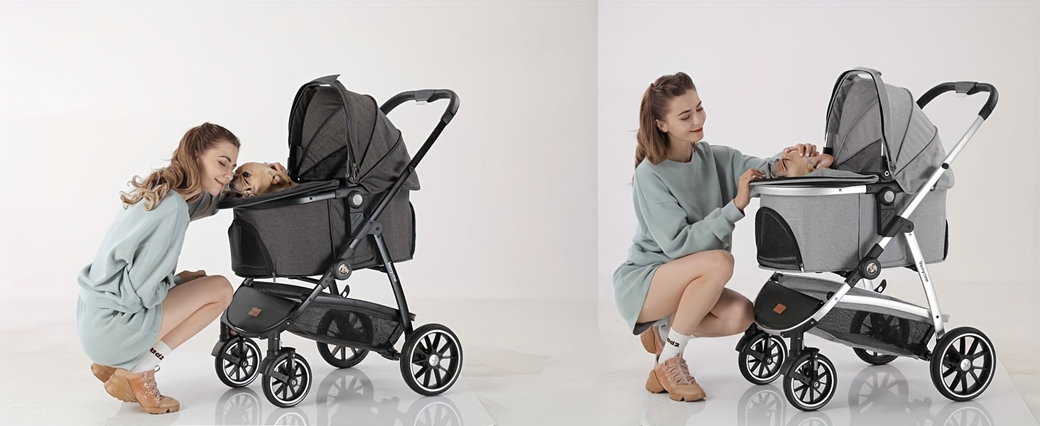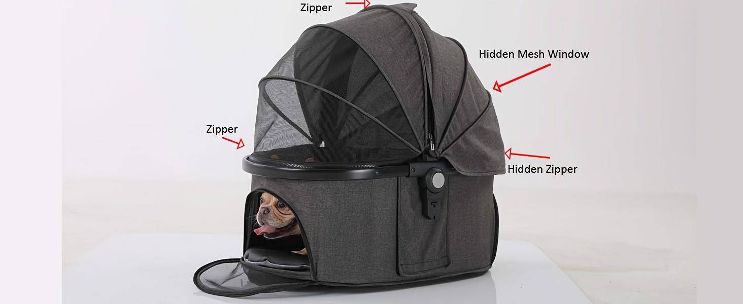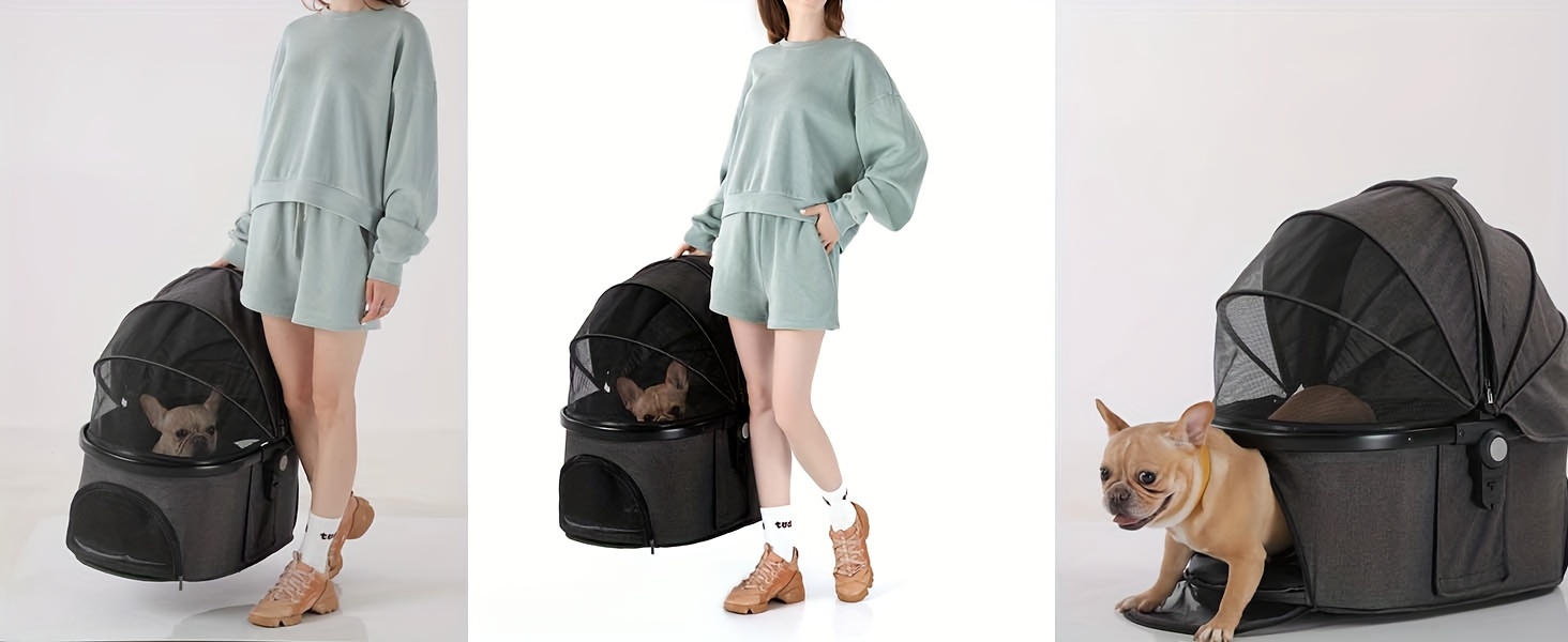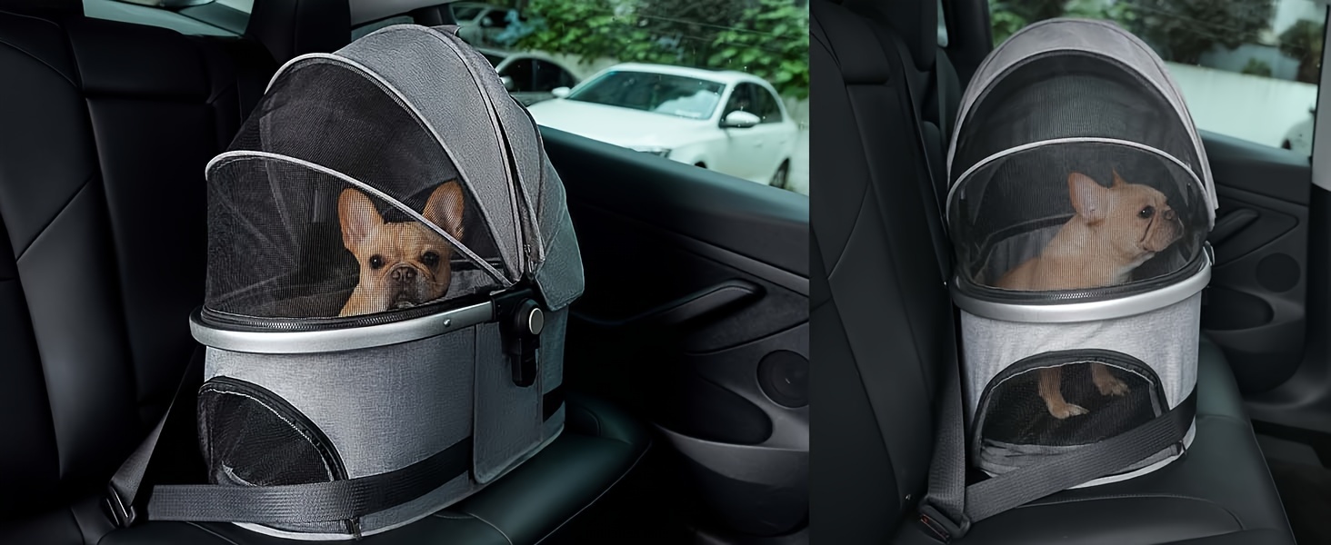 The stroller offers flexibility and ease: It includes several mesh windows to improve air circulation and visibility, as well as multiple openings for effortless pet entry. The carrier can also be used independently as a car seat. Thanks to its simple assembly and foldable design, your journeys with your pet become more convenient.