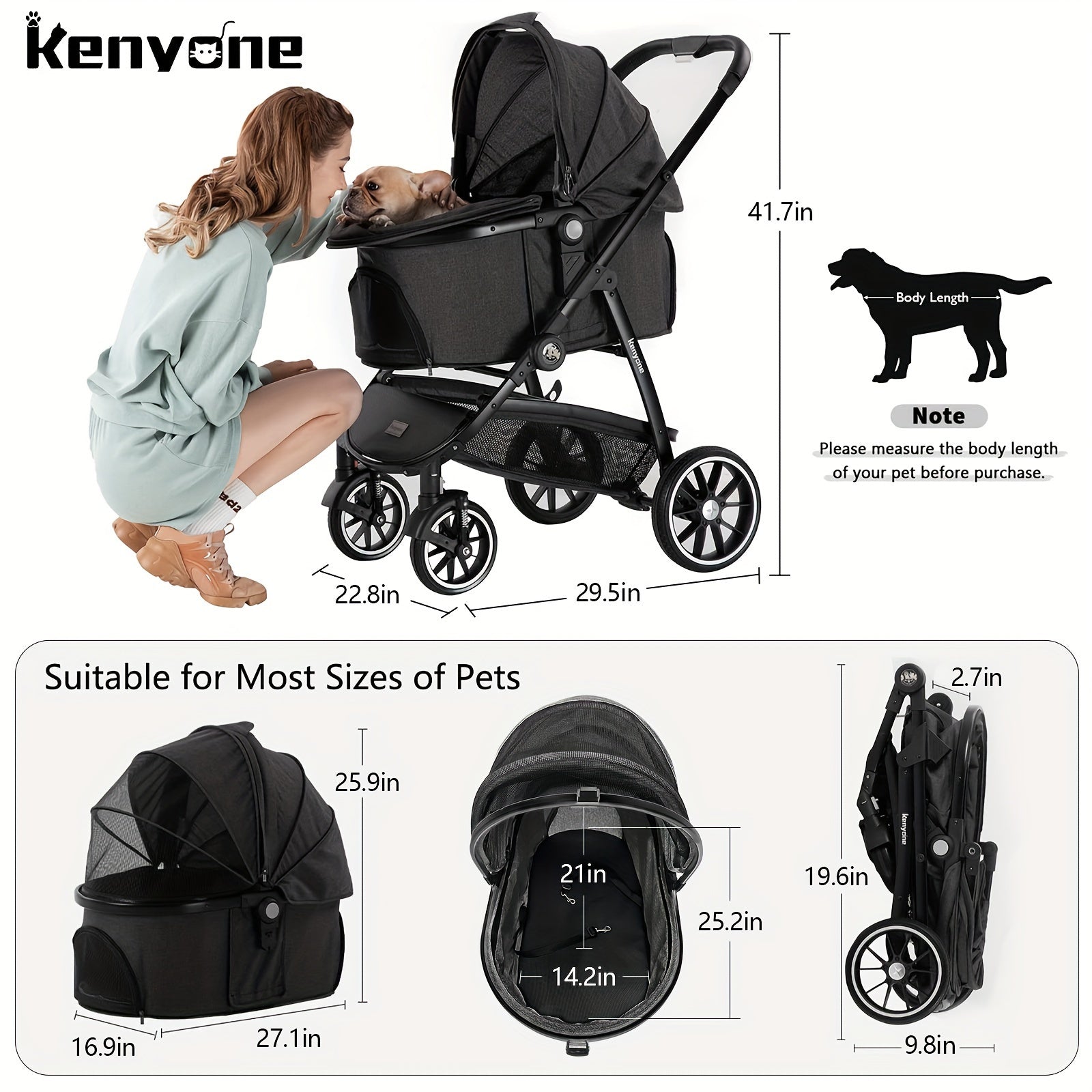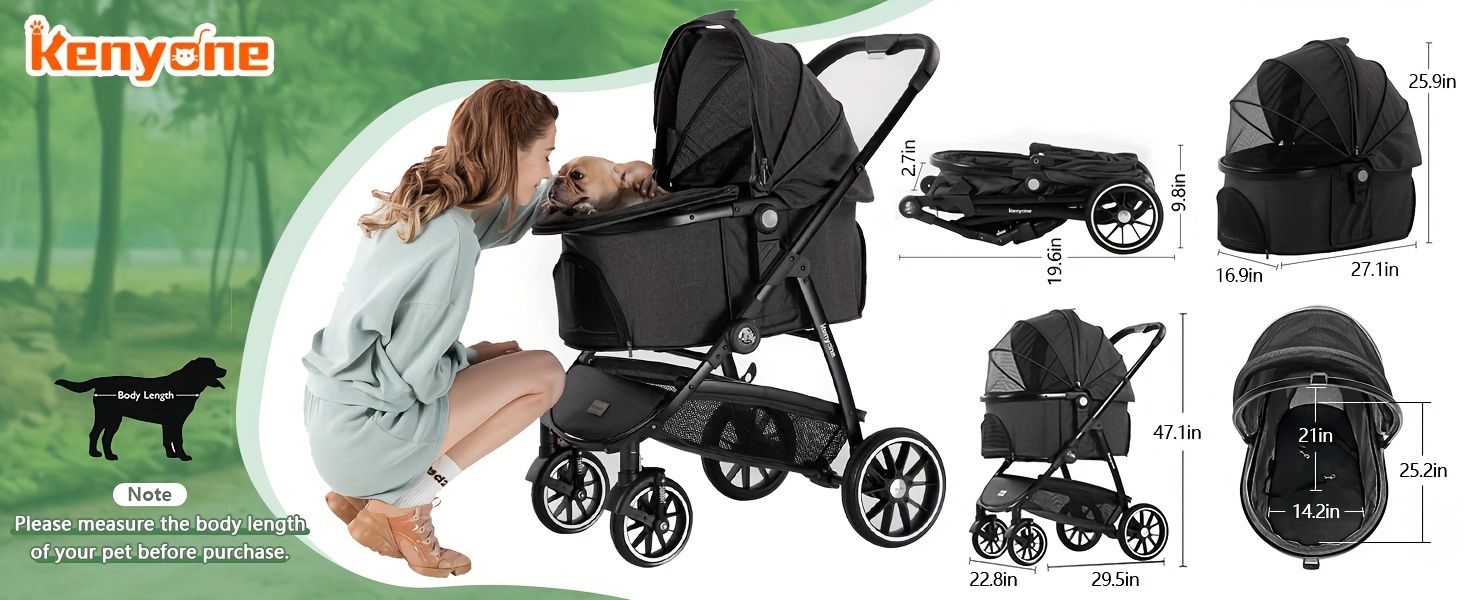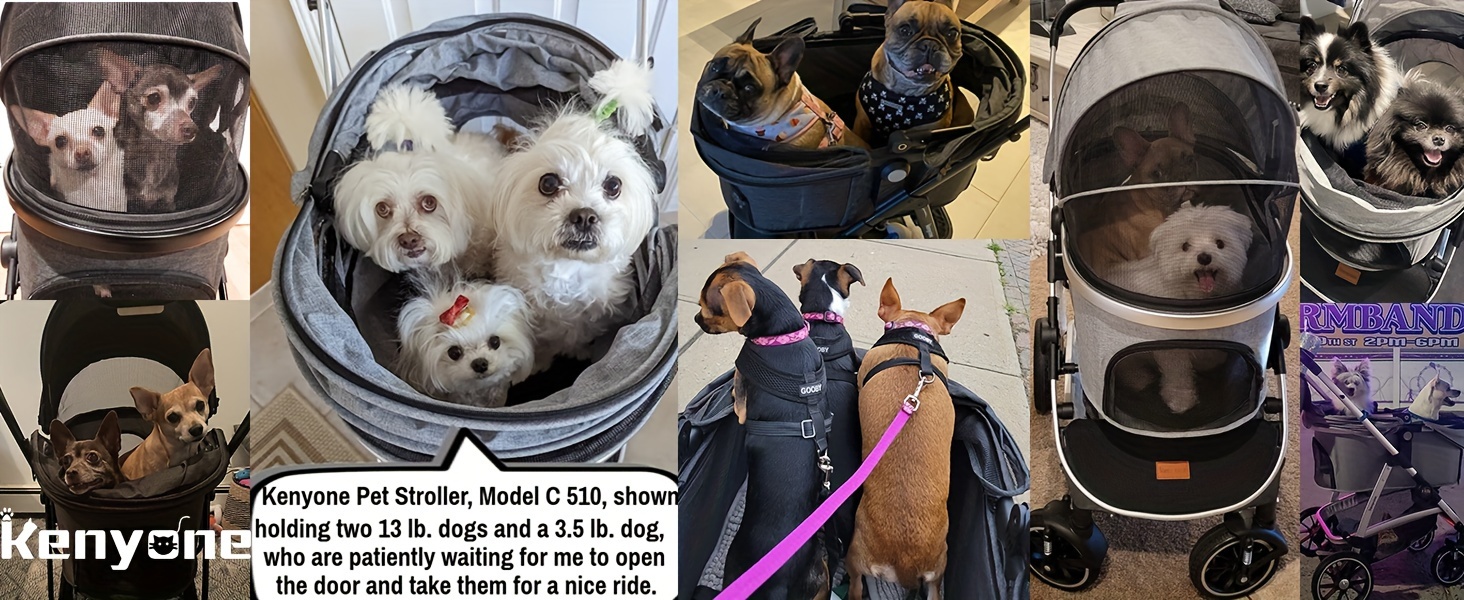 The Kenyone C510 has dimensions of 29.5"L x 22.8"W x 41.7"H and when folded, it measures 32.7"L x 19.6"W x 9.8"H. The external carriage measures 27.1"L x 16.9"W x 25.9"H, while the internal carriage measures 25.2"L x 14.2"W x 21"H. It can hold 3-4 small dog strollers weighing 10 lbs each, two medium dog strollers weighing 20 lbs each, or one large dog stroller weighing 50 lbs. Before purchasing, it is important to measure your pet and compare it with the dimensions of the internal carriage to ensure a comfortable fit.