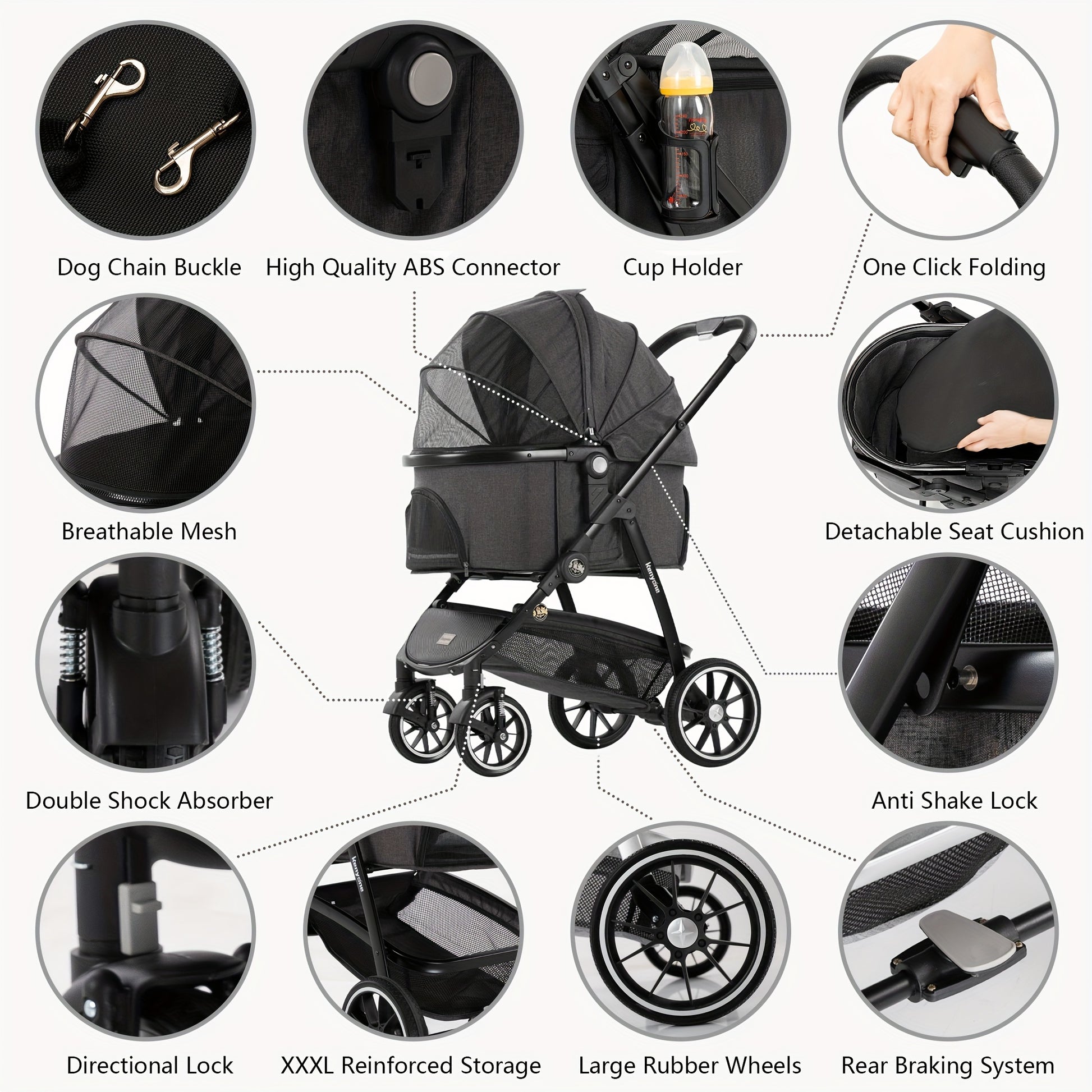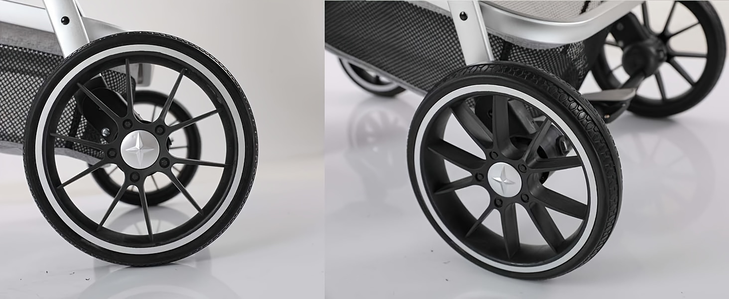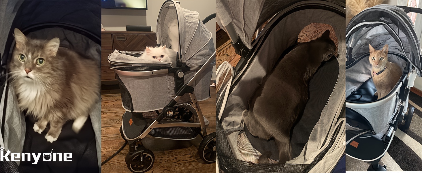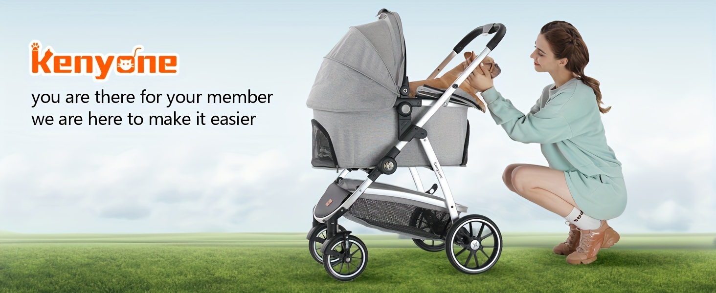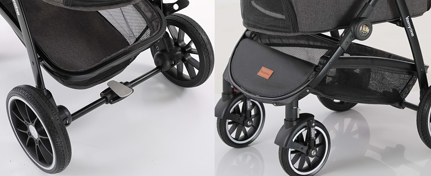 The Kenyone C510 cat stroller ensures a safe and smooth ride with its high-quality solid rubber wheels that are leak-proof. It is equipped with a front wheel that has double spring shock absorption for a comfortable walking experience. Additionally, the stroller is designed with a one-foot brake and a secure pet rope buckle to enhance safety.