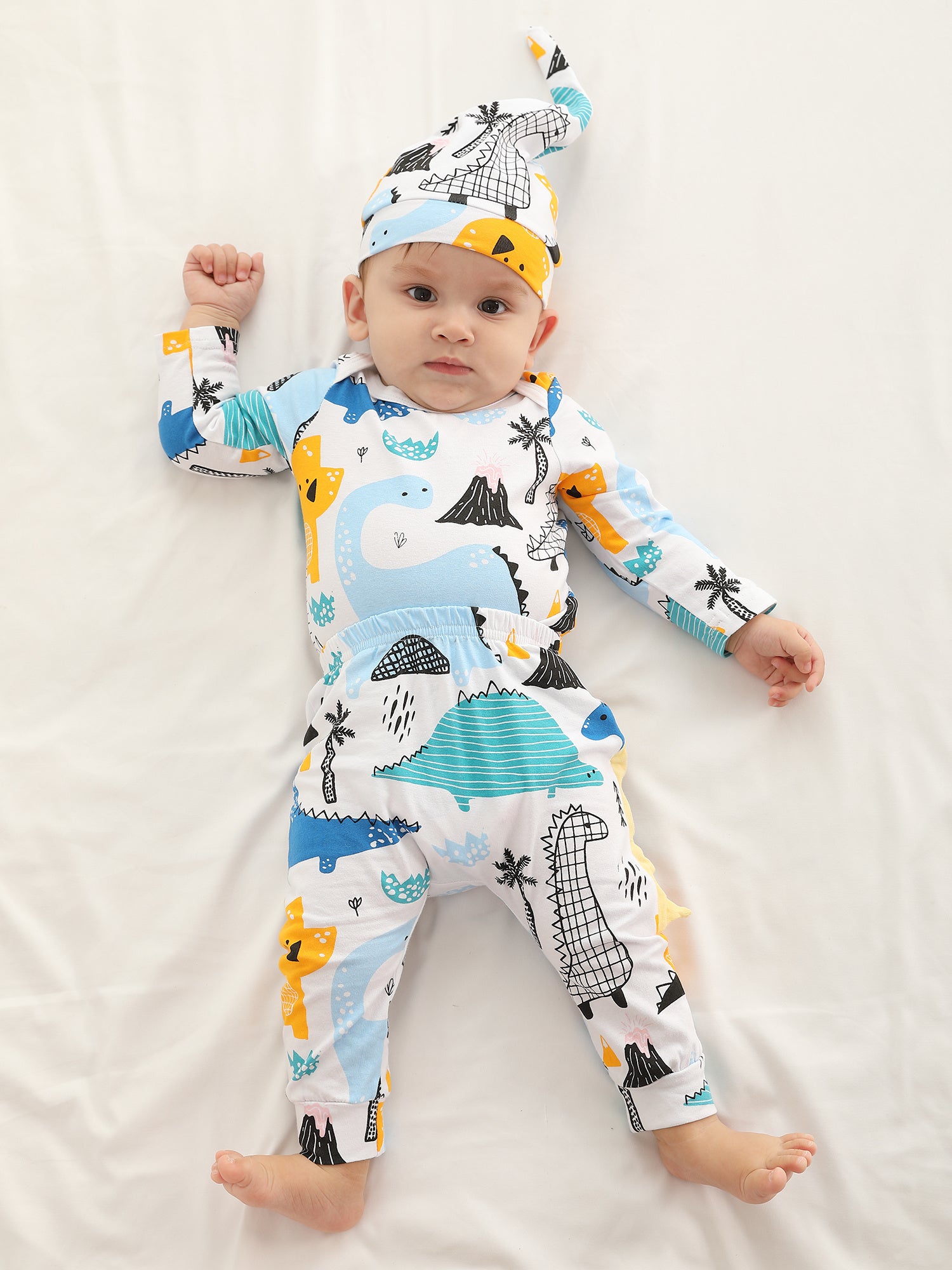KuKitty Newborn Baby Boy 3pc Cotton Long Sleeve Romper Top Pant Hat Dinosaur Outfit Set