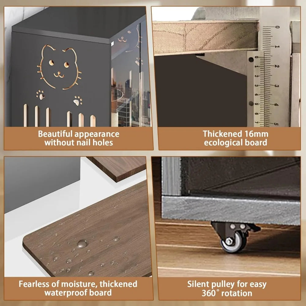Constructed from premium materials, this cat enclosure features a horizontal sliding closure for easy access and enhanced safety. Unlike typical cat condos, our design ensures that your pets are securely enclosed while still enjoying a view of their surroundings. Plus, with wheels for effortless mobility, you can easily reposition the villa anywhere you desire!