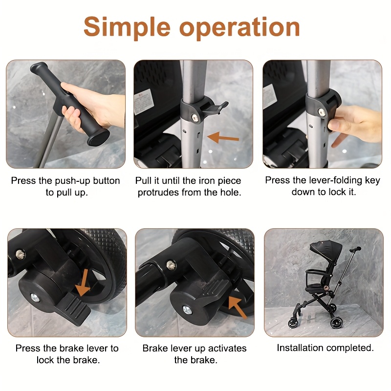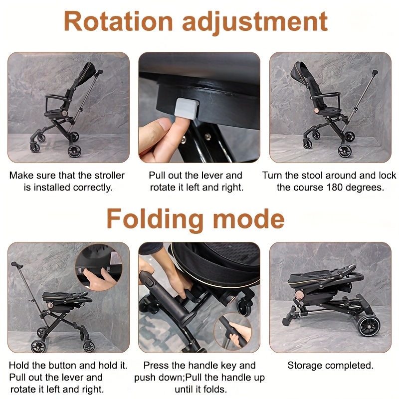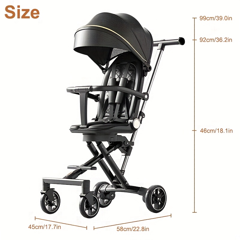 The stroller features a foldable design with adjustable angles. It is cleverly crafted for parents to conveniently transport and store when out and about. Its ability to fold allows it to shrink into a compact size, conserving space and making it ideal for fitting in a car trunk or tucking away in a corner of the house.