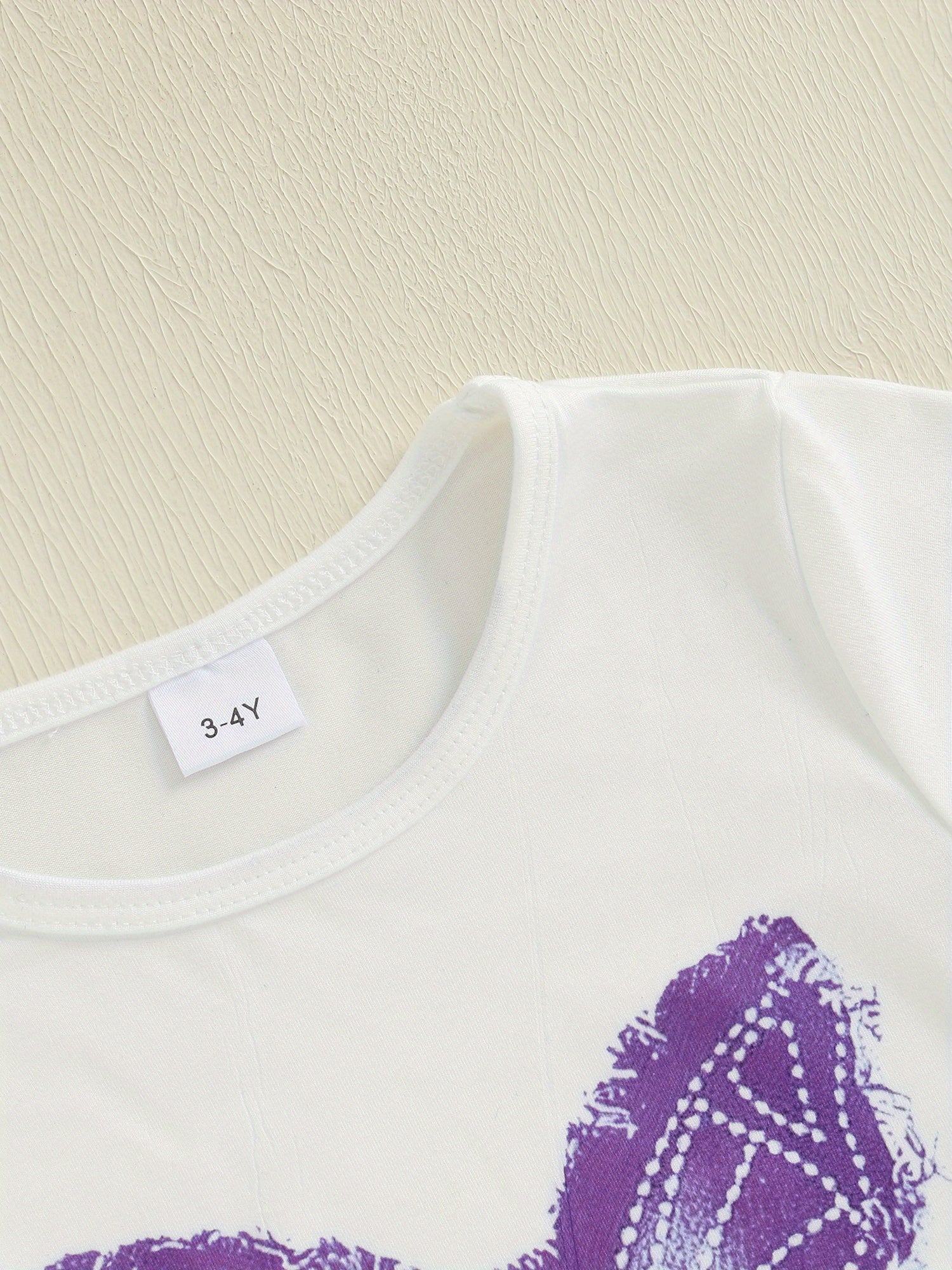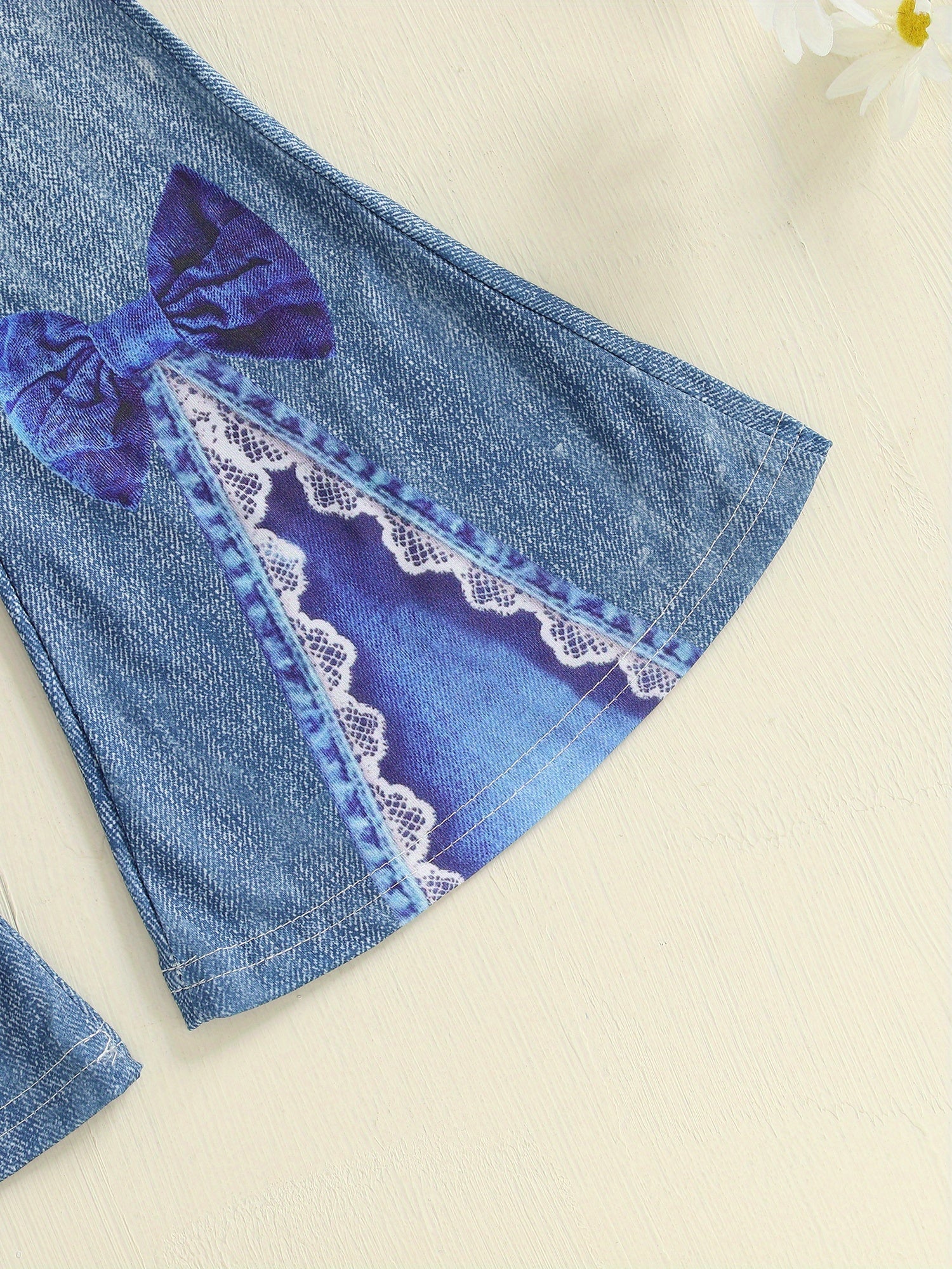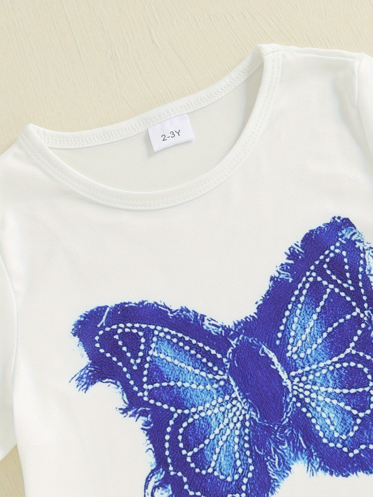 Little Toddler Girl Summer Outfit Butterfly Pattern Crew Neck Short Sleeve T-Shirt and Denim Bell Bottoms 2pcs Set, Perfect for Outdoor