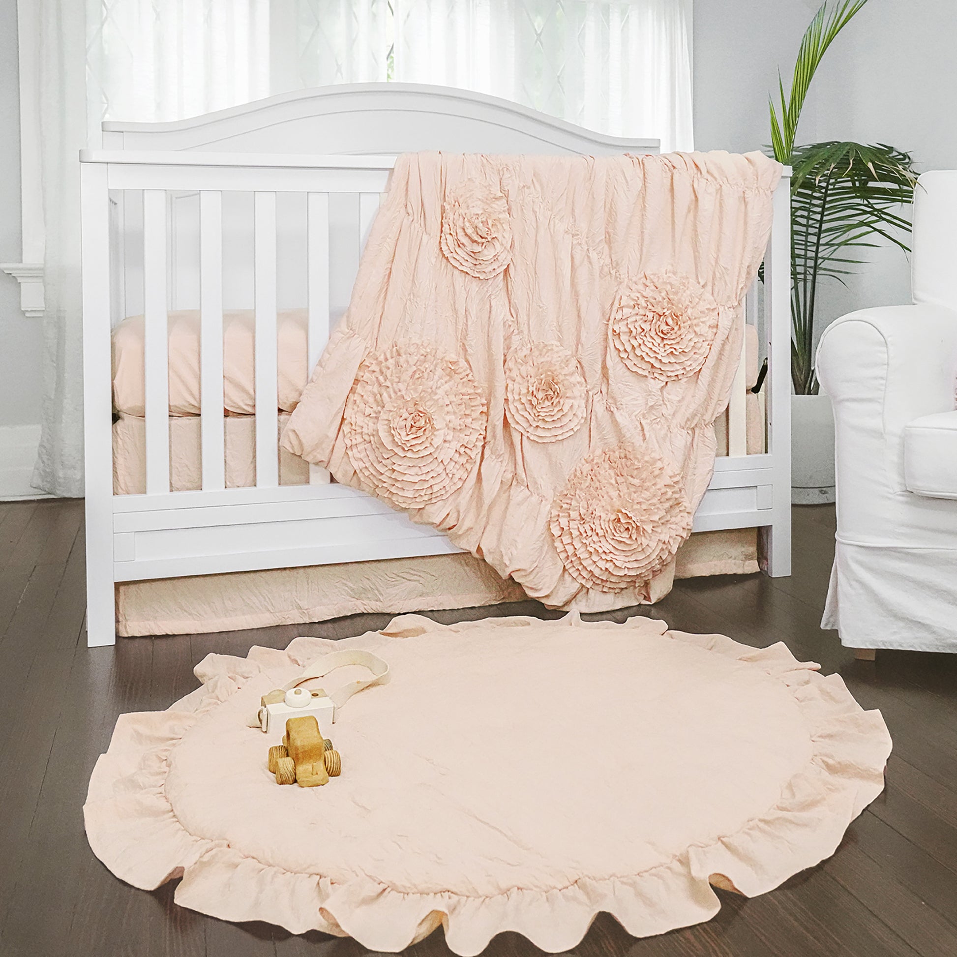 Elevate your little one's room with this soft bedding set featuring 3 lovely, coordinated pieces. The quilt features large hand crafted ruched flowers for a versatile design that will fit any decor. Add a flowery flourish to your home with this super soft bedding set. The solid, textured mini quilt is designed with large hand-crafted ruched fabric flowers, creating a fresh and fun look. This set coordinates perfectly with the ultra-soft fitted sheet and a tailored crib skirt that features split corners for easy attachment around the crib. Perfect for classic, modern, transitional or cottage or themed rooms, the design of this solid 3-piece set is flexible enough to suit any decor style. Easy-care fabric makes upkeep of this bedding set a breeze. Please refer to label for full care instructions.