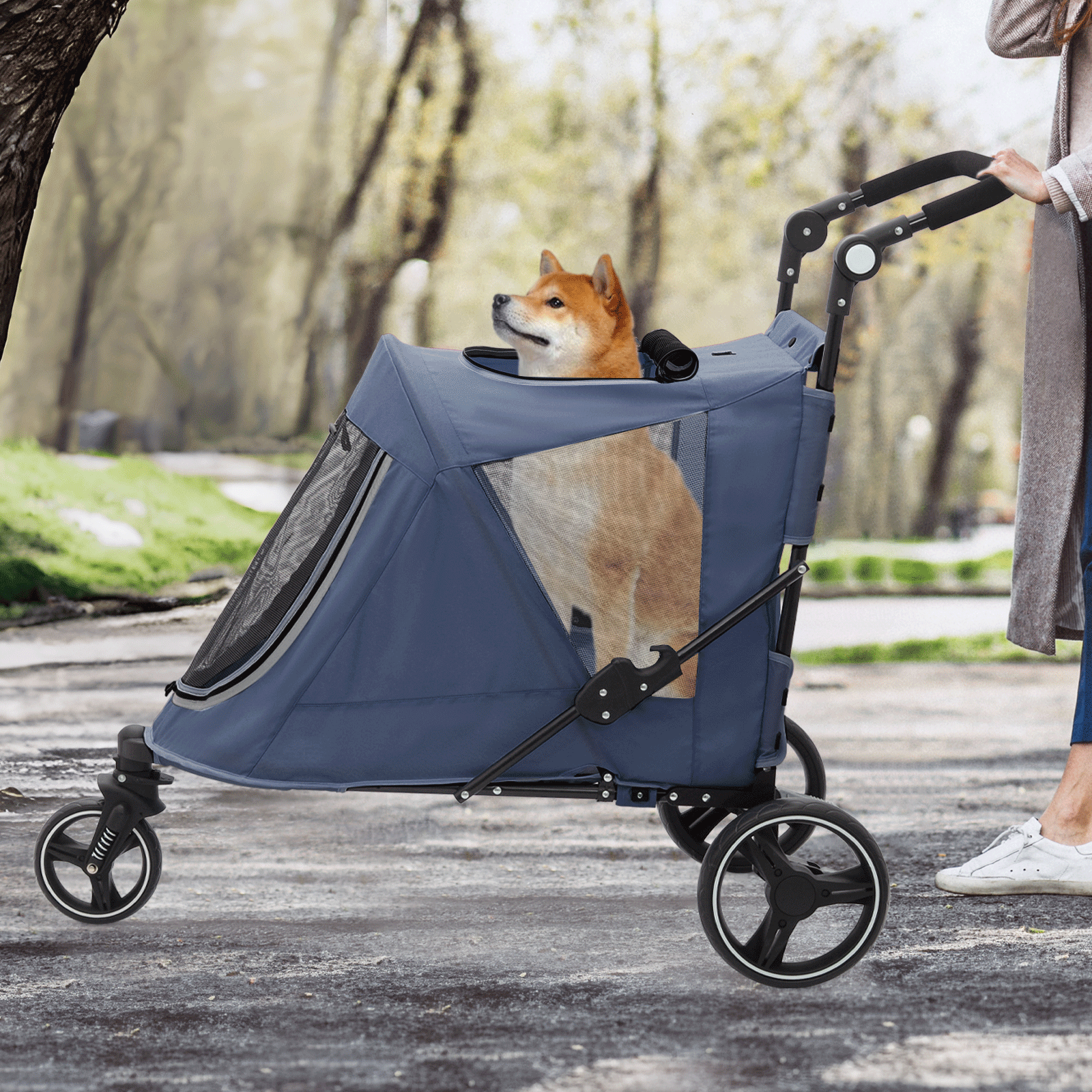Introducing our premium Pet Stroller – the perfect blend of comfort, convenience, and durability for your furry friend. It features an adjustable multi-position handle for a comfortable stroll, and a dual-entry design catering to the needs of elderly or injured pets. Crafted with robust materials, including thickened iron pipes and shock-absorbing rubber wheels, it ensures a stable, smooth ride on various terrains. The locking rear wheels add extra safety, making this stroller an ideal choice for pet owners seeking a blend of functionality and style.