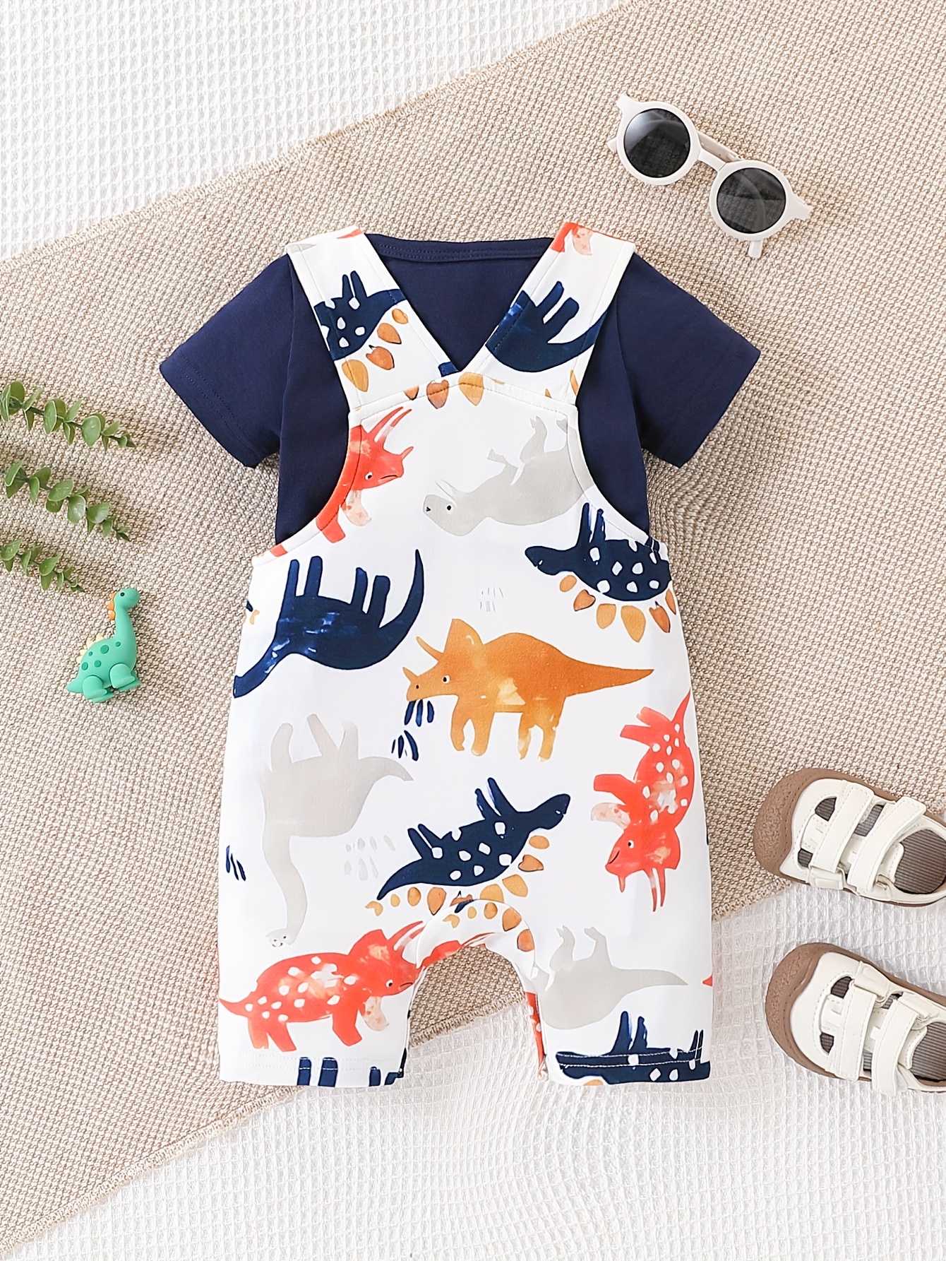 Newborn Baby Boy Clothes Toddler Boys' Short Sleeve T-Shirt+Dinosaur Print Overalls Jumpsuit Short Pants 2pcs Outfits Sets, Perfect for Outdoor