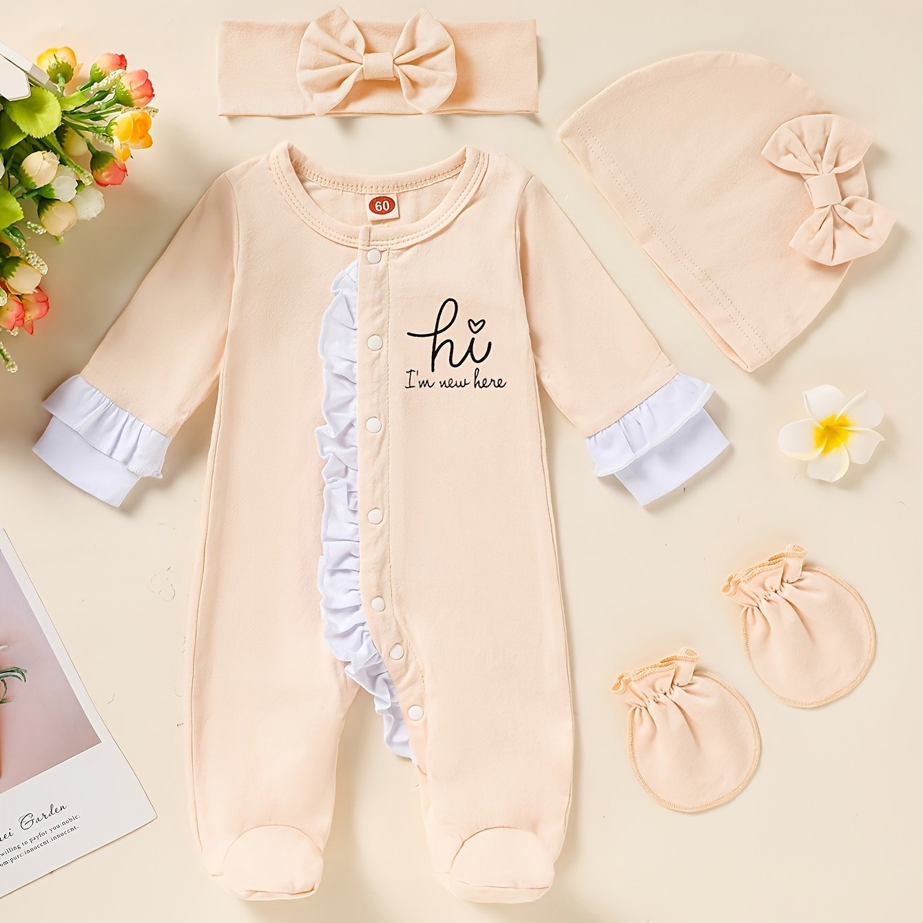 - All-in-one outfit: romper with mittens and a headband for easy dressing and cohesive styling.
