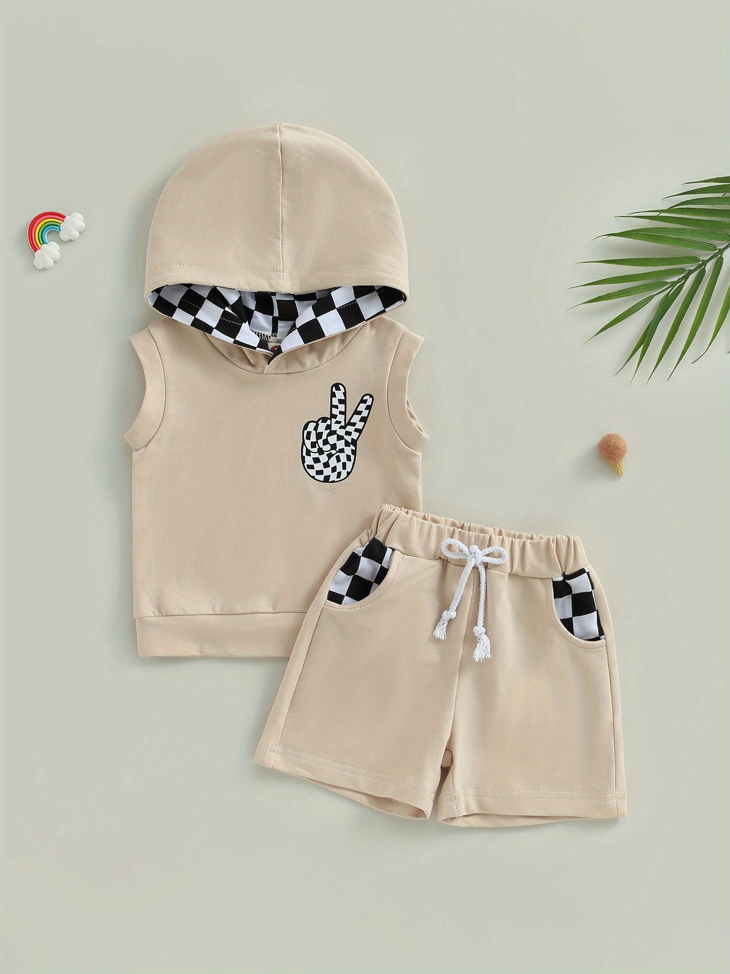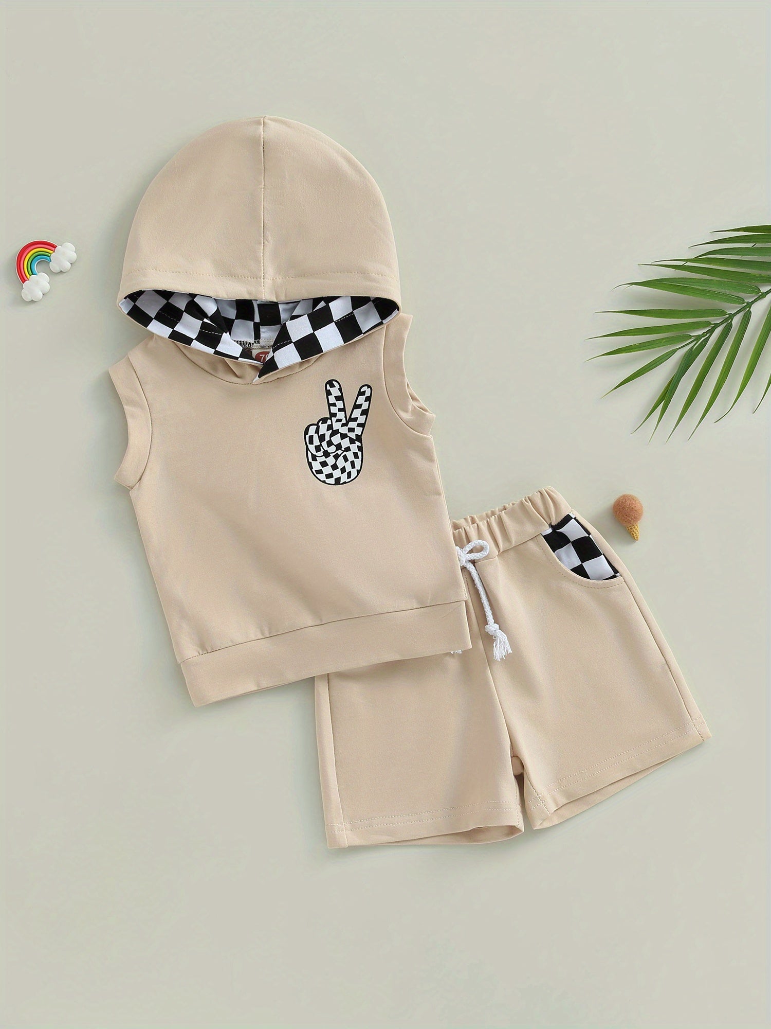 Toddler Boys 2 Piece Sleeveless Hooded Vest and Checkerboard Shorts Set for Outdoors