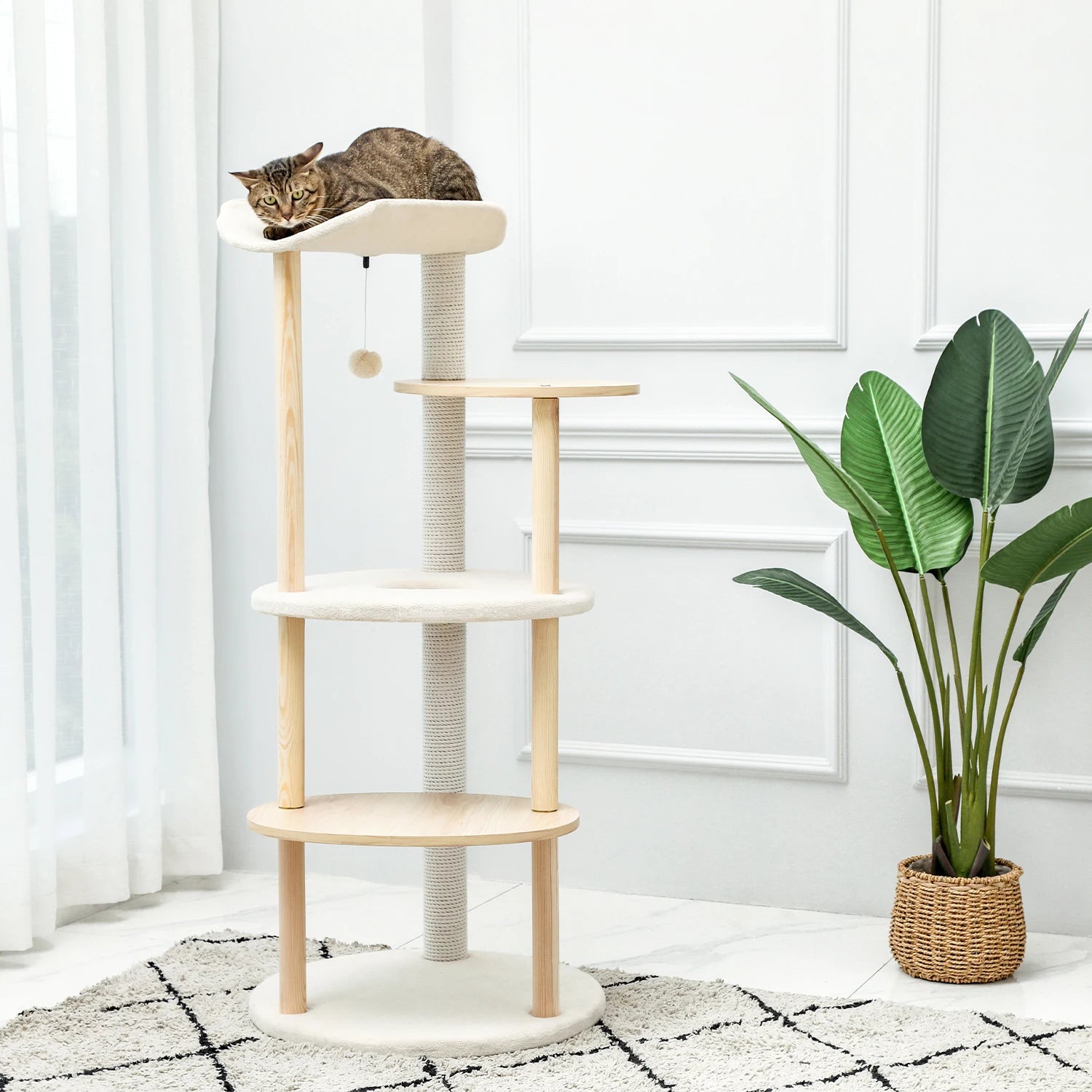 MODERN DESIGN: The wooden elements added in this cat tower and the irregular platforms modernize the whole cat tree. When designing this cat tree, the color of beige was widely employed to create a warm and harmonious tone. It can also be perfectly fit in furniture with various styles.