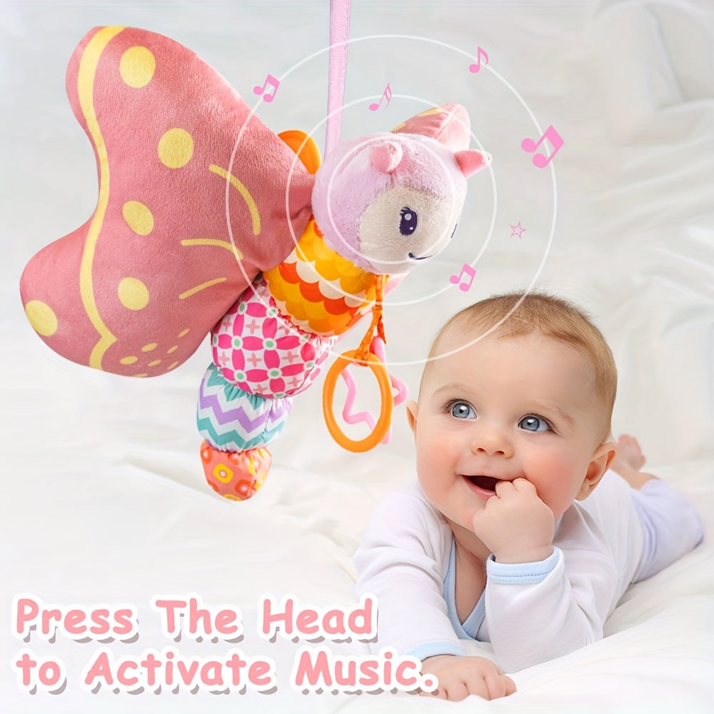 Plush Pink Butterfly Sensory Toy for Babies with Hanging Ring Rattle and Wrinkled Wings